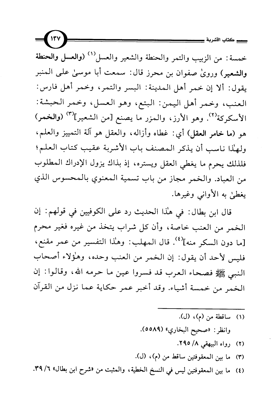 قال ابن بطال: في هذا الحديث رد على الكوفيين في قولهم: إن الخمر من العنب خاصة، وأن كل شراب يتخذ من غيره فغير محرم [ما دون السكر منه] (¬4). قال المهلب: وهذا التفسير من عمر مقنع، فليس لأحد أن يقول: إن الخمر من العنب وحده، وهؤلاء أصحاب النبي - صلى الله عليه وسلم - فصحاء العرب قد فسروا عين ما حرمه الله، وقالوا: إن الخمر من خمسة أشياء. وقد أخبر عمر حكاية عما نزل من القرآن