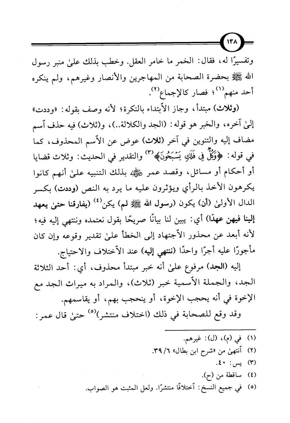 (وثلاث) مبتدأ، وجاز الابتداء بالنكرة؛ لأنه وصف بقوله: "وددت" إلى آخره، والخبر هو قوله: (الجد والكلالة .. )، و (ثلاث) فيه حذف اسم مضاف إليه والتنوين في آخر (ثلاث) عوض عن الاسم المحذوف، كما في قوله: {وَكُلٌّ فِي فَلَكٍ يَسْبَحُونَ} (¬3) والتقدير في الحديث: وثلاث قضايا أو أحكام أو مسائل، وقصد عمر -رضي الله عنه- بذلك التنبيه على أنهم كانوا يكرهون الأخذ بالرأي ويؤثرون عليه ما يرد به النص (وددت) بكسر الدال الأولى (أن) يكون (رسول الله - صلى الله عليه وسلم - لم) يكن (¬4) (يفارقنا حتى يعهد إلينا فيهن عهدًا) أي: يبين لنا بيانًا صريحًا بقول نعتمده وننتهي إليه فيه؛ لأنه أبعد عن محذور الاجتهاد إلى الخطأ على تقدير وقوعه وإن كان مأجورًا عليه أجرًا واحدًا (ننتهي إليه) عند الاختلاف والاحتياج.