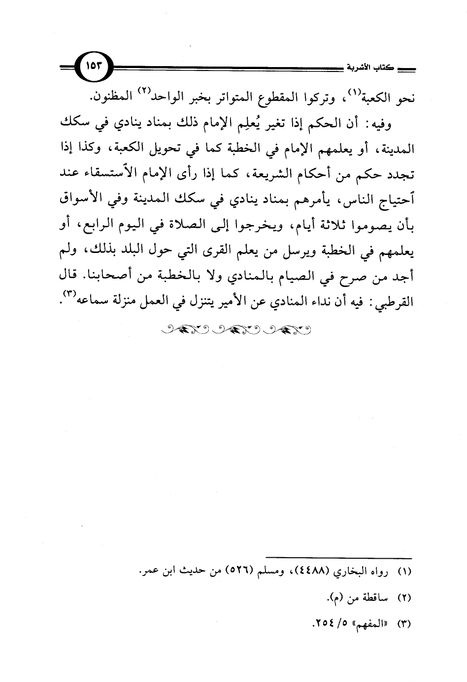 نحو الكعبة (¬1)، وتركوا المقطوع المتواتر بخبر الواحد (¬2) المظنون. وفيه: أن الحكم إذا تغير يُعلِم الإمام ذلك بمناد ينادي في سكك المدينة، أو يعلمهم الإمام في الخطبة كما في تحويل الكعبة، وكذا إذا تجدد حكم من أحكام الشريعة، كما إذا رأى الإمام الاستسقاء عند احتياج الناس، يأمرهم بمناد ينادي في سكك المدينة وفي الأسواق بأن يصوموا ثلاثة أيام، ويخرجوا إلى الصلاة في اليوم الرابع، أو يعلمهم في الخطبة ويرسل من يعلم القرى التي حول البلد بذلك، ولم أجد من صرح في الصيام بالمنادي ولا بالخطبة من أصحابنا. قال القرطبي: فيه أن نداء المنادي عن الأمير يتنزل في العمل منزلة سماعه (¬3).