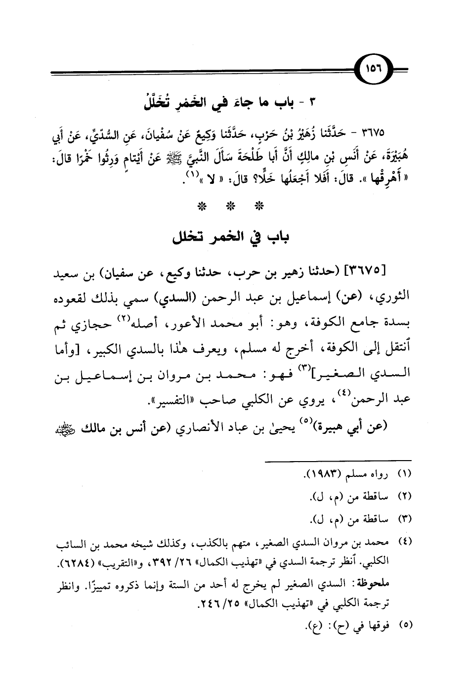 3675 - حَدَّثَنا زُهَيْرُ بْنُ حَرْبٍ، حَدَّثَنا وَكِيعٌ عَنْ سُفْيانَ، عَنِ السُّدّيِّ، عَنْ أَبي هُبَيْرَةَ، عَنْ أَنَسِ بْنِ مالِكٍ أَنَّ أَبا طَلْحَةَ سَأَلَ النَّبيَّ - صلى الله عليه وسلم - عَنْ أَيْتامٍ وَرِثُوا خَمْرًا قَالَ: "أَهْرِقْها". قَالَ: أَفَلا أَجْعَلُها خَلاٍّ؟ قَالَ: "لا" (¬1).
