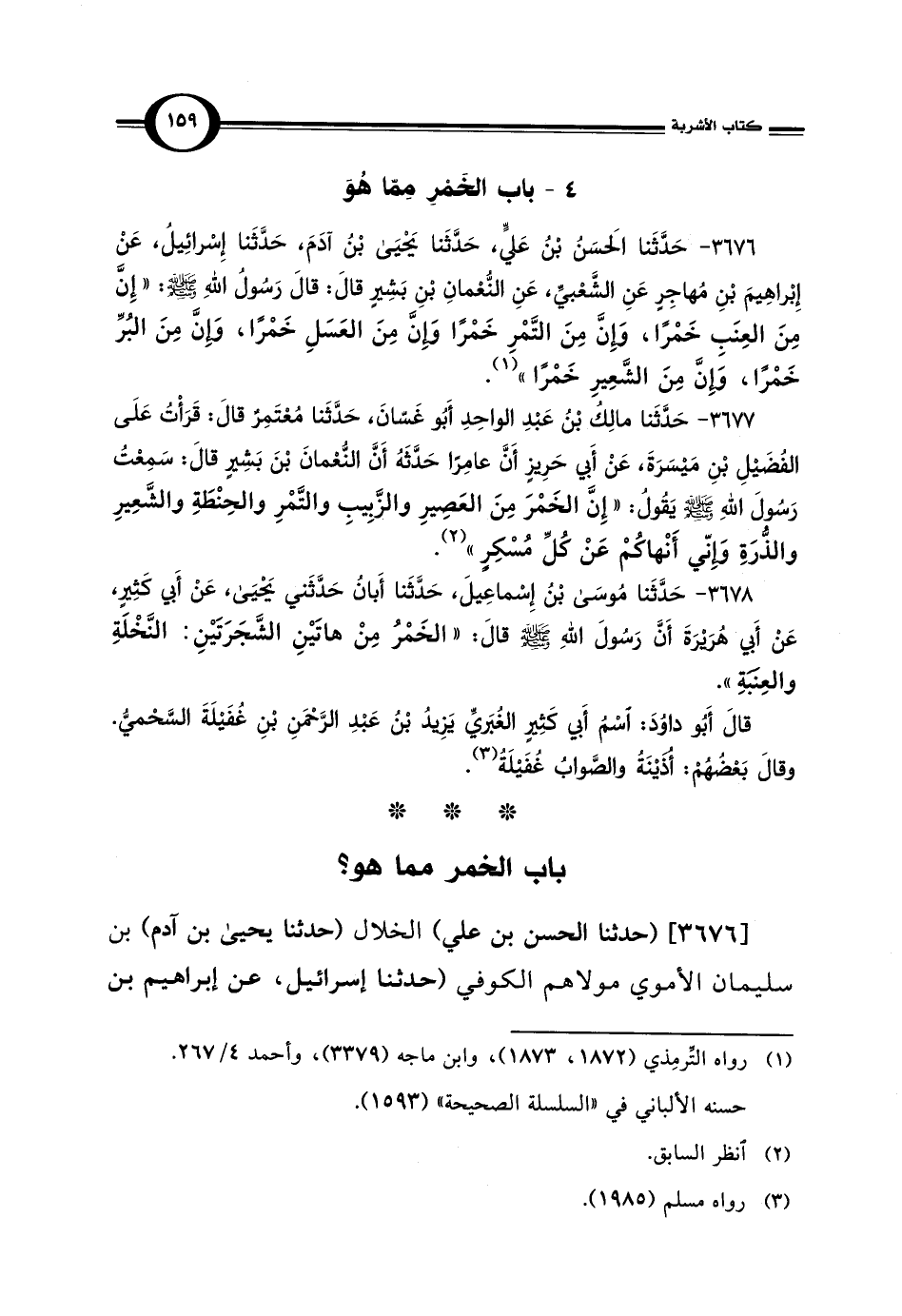 3676 - حَدَّثَنا الحَسَنُ بْنُ عَليٍّ، حَدَّثَنا يَحْيَى بْنُ آدَمَ، حَدَّثَنا إِسْرائِيلُ، عَنْ إِبْراهِيمَ بْنِ مُهاجِرٍ عَنِ الشَّعْبيِّ، عَنِ النُّعْمانِ بْنِ بَشِيرٍ قَالَ: قَالَ رَسُولُ اللهِ - صلى الله عليه وسلم -: "إِنَّ مِنَ العِنَبِ خَمْرًا، وَإِنَّ مِنَ التَّمْرِ خَمْرًا وَإِنَّ مِنَ العَسَلِ خَمْرًا، وَإِنَّ مِنَ البُرِّ خَمْرًا، وَإِنَّ مِنَ الشَّعِيرِ خَمْرًا" (¬1).