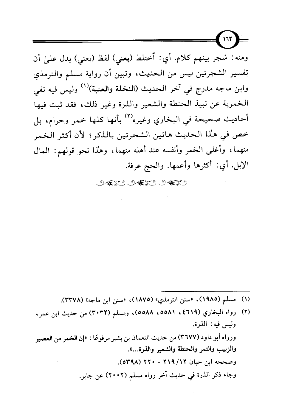 ومنه: شجر بينهم كلام. أي: اختلط (يعني) لفظ (يعني) يدلّ على أن تفسير الشجرتين ليس من الحديث، وتبين أن رواية مسلم والترمذي وابن ماجه مدرج في آخر الحديث (النخلة والعنبة) (¬1) وليس فيه نفي الخمرية عن نبيذ الحنطة والشعير والذرة وغير ذلك، فقد ثبت فيها أحاديث صحيحة في البخاري وغيره (¬2) بأنها كلها خمر وحرام، بل خص في هذا الحديث هاتين الشجرتين بالذكر؛ لأنَّ أكثر الخمر منهما، وأغلى الخمر وأنفسه عند أهله منهما، وهذا نحو قولهم: المال الإبل. أي: أكثرها وأعمها. والحج عرفة.