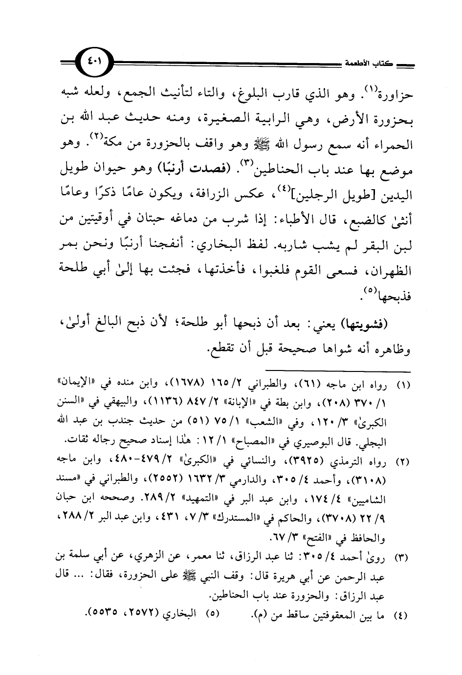 حزاورة (¬1). وهو الذي قارب البلوغ، والتاء لتأنيث الجمع، ولعله شبه بحزورة الأرض، وهي الرابية الصغيرة، ومنه حديث عبد اللَّه بن الحمراء أنه سمع رسول اللَّه -صلى اللَّه عليه وسلم- وهو واقف بالحزورة من مكة (¬2). وهو موضع بها عند باب الحناطين (¬3). (فصدت أرنبًا) وهو حيوان طويل اليدين [طويل الرجلين] (¬4)، عكس الزرافة، ويكون عامًا ذكرًا وعامًا أنثى كالضبع، قال الأطباء: إذا شرب من دماغه حبتان في أوقيتين من لبن البقر لم يشب شاربه. لفظ البخاري: أنفجنا أرنبًا ونحن بمر الظهران، فسعى القوم فلغبوا، فأخذتها، فجئت بها إلى أبي طلحة فذبحها (¬5).