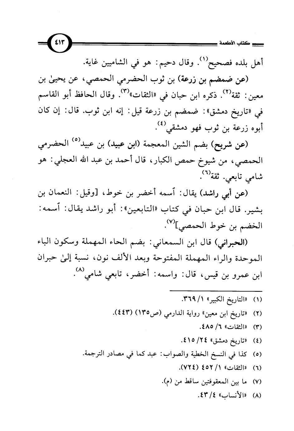 (الحبراني) قال ابن السمعاني: بضم الحاء المهملة وسكون الباء الموحدة والراء المهملة المفتوحة وبعد الألف نون، نسبة إلى حبران ابن عمرو بن قيس، قال: واسمه: أخضر، تابعي شامي (¬8).