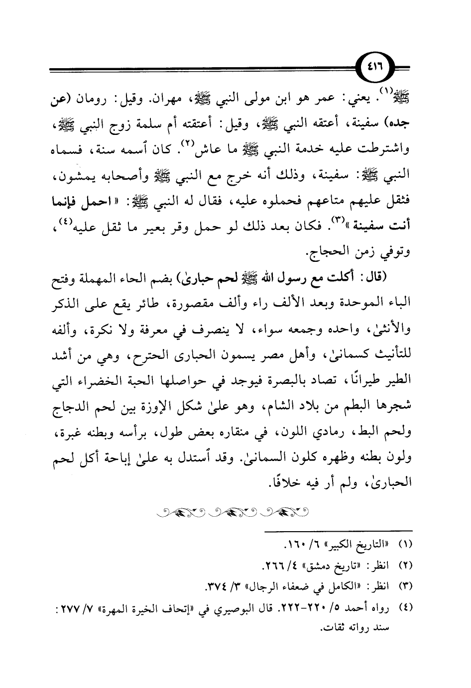 -صلى اللَّه عليه وسلم- (¬1). يعني: عمر هو ابن مولى النبي، مهران. وقيل: رومان (عن جده) سفينة، أعتقه النبي -صلى اللَّه عليه وسلم-، وقيل: أعتقته أم سلمة زوج النبي -صلى اللَّه عليه وسلم-، واشترطت عليه خدمة النبي -صلى اللَّه عليه وسلم- ما عاش (¬2). كان اسمه سنة، فسماه النبي -صلى اللَّه عليه وسلم-: سفينة، وذلك أنه خرج مع النبي -صلى اللَّه عليه وسلم- وأصحابه يمشون، فثقل عليهم متاعهم فحملوه عليه، فقال له النبي -صلى اللَّه عليه وسلم-: "احمل فإنما أنت سفينة" (¬3). فكان بعد ذلك لو حمل وقر بعير ما ثقل عليه (¬4)، وتوفي زمن الحجاج.