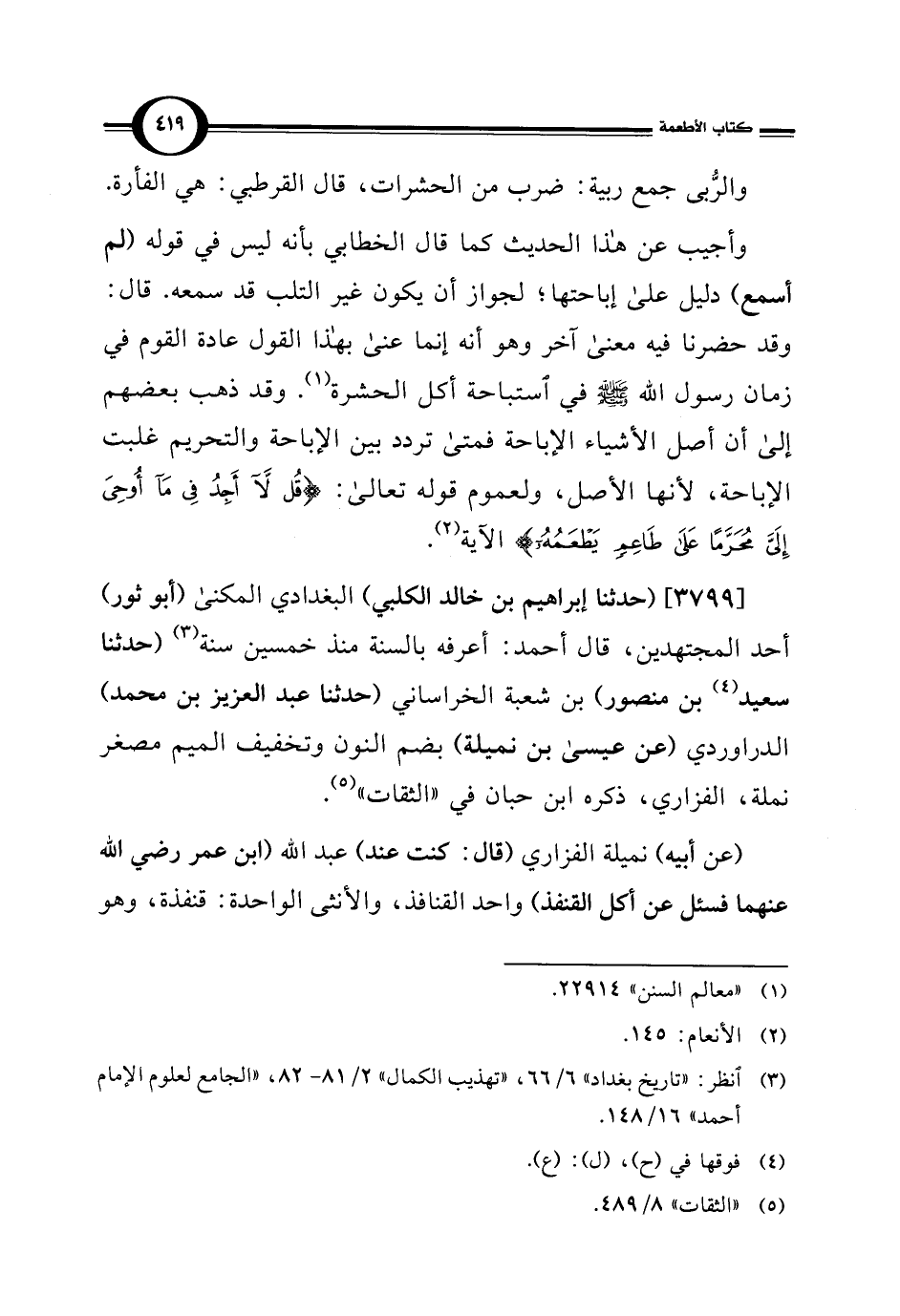 [3799] (حدثنا إبراهيم بن خالد الكلبي) البغدادي المكنى (أبو ثور) أحد المجتهدين، قال أحمد: أعرفه بالسنة منذ خمسين سنة (¬3) (حدثنا سعيد (¬4) بن منصور) بن شعبة الخراساني (حدثنا عبد العزيز بن محمد) الدراوردي (عن عيسى بن نميلة) بضم النون وتخفيف الميم مصغر نملة، الفزاري، ذكره ابن حبان في "الثقات" (¬5).