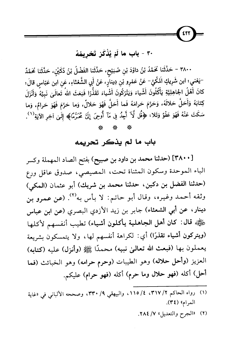 [3800] (حدثنا محمد بن داود بن صبيح) بفتح الصاد المهملة وكسر الباء الموحدة وسكون المثناة تحت، المصيصي، صدوق عاقل ورع (حدثنا الفضل بن دكين، حدثنا محمد بن شريك) أبو عثمان (المكي) وثقه أحمد وغيره، وقال أبو حاتم: لا بأس به (¬2). (عن عمرو بن دينار، عن أبي الشعثاء) جابر بن زيد الأزدي البصري (عن ابن عباس -رضي اللَّه عنهما- قال: كان أهل الجاهلية يأكلون أشياء) تطيب أنفسهم لأكلها (ويتركون أشياء تقذرًا) أي: لكراهة أنفسهم لها، ولا يتمسكون بشريعة يعملون بها (فبعث اللَّه تعالى نبيه) محمدًا -صلى اللَّه عليه وسلم- (وأنزل) عليه (كتابه) العزيز (وأحل حلاله) وهو الطيبات (وحرم حرامه) وهو الخبائث (فما أحل) أكله (فهو حلال وما حرم) أكله (فهو حرام) عليكم.