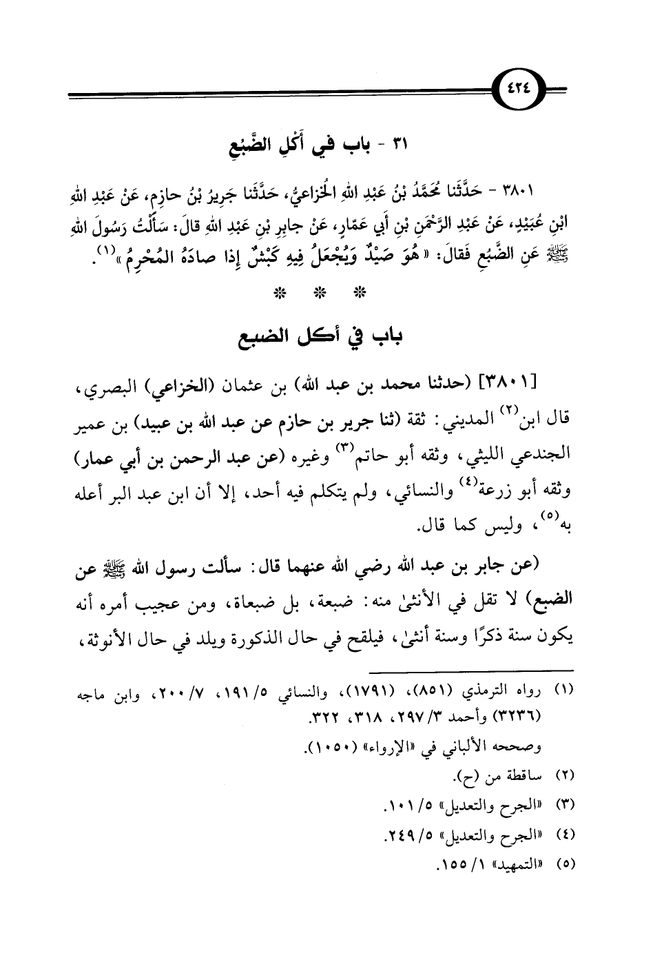 (عن جابر بن عبد اللَّه رضي اللَّه عنهما قال: سألت رسول اللَّه -صلى اللَّه عليه وسلم- عن الضبع) لا تقل في الأنثى منه: ضبعة، بل ضبعاة، ومن عجيب أمره أنه يكون سنة ذكرًا وسنة أنثى، فيلقح في حال الذكورة ويلد في حال الأنوثة،