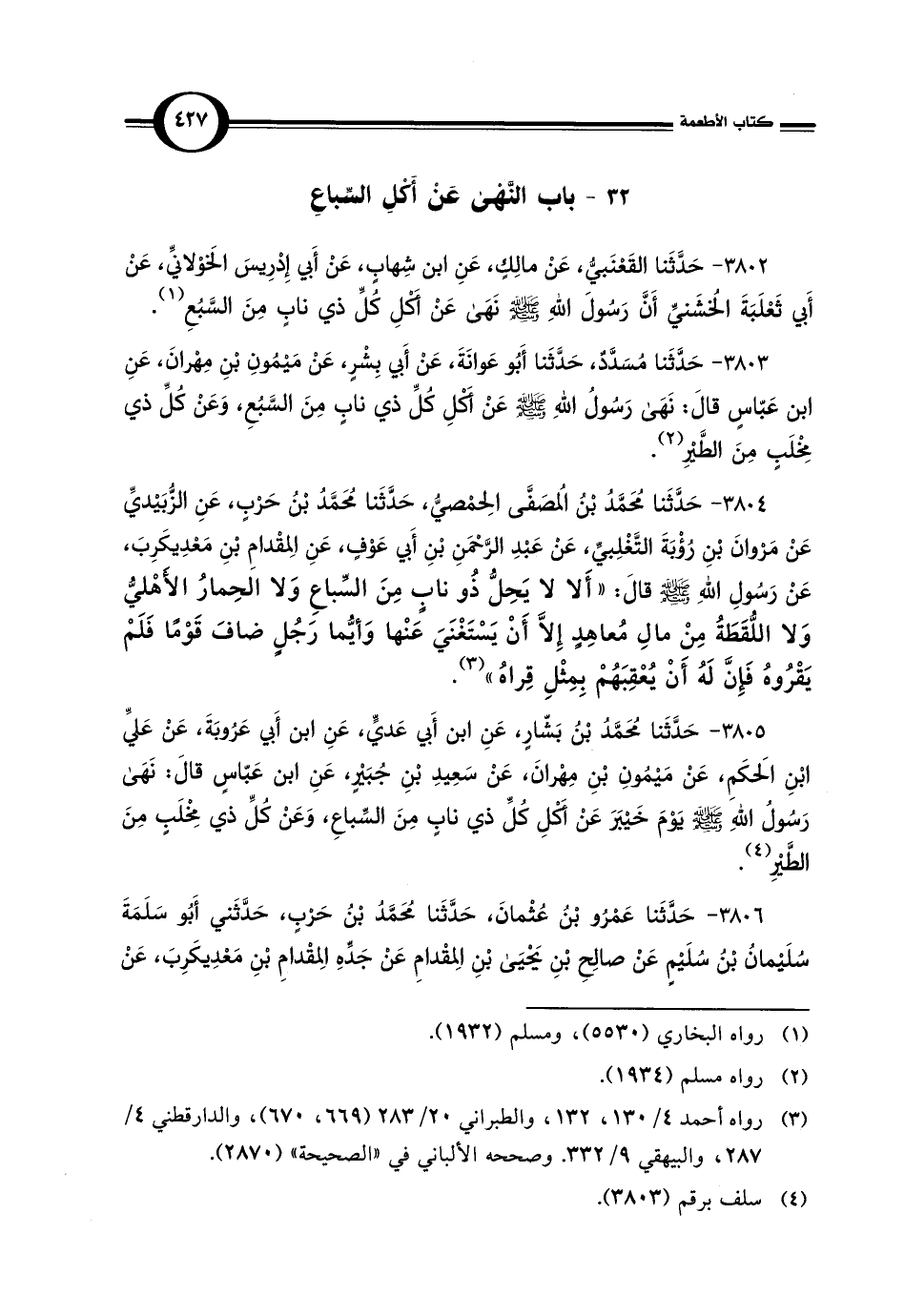 3803 - حَدَّثَنَا مُسَدَّدٌ، حَدَّثَنَا أَبُو عَوانَةَ، عَنْ أَبي بِشْرٍ، عَنْ مَيْمُونِ بْنِ مِهْرانَ، عَنِ ابن عَبّاسٍ قالَ: نَهَى رَسُولُ اللَّهِ -صلى اللَّه عليه وسلم- عَنْ أَكْلِ كُلِّ ذي نَابٍ مِنَ السَّبُعِ، وَعَنْ كُلِّ ذي مِخْلَبٍ مِنَ الطَّيْرِ (¬2).