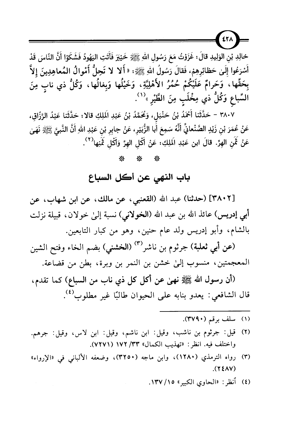 [3802] (حدثنا) عبد اللَّه (القعنبي، عن مالك، عن ابن شهاب، عن أبي إدريس) عائذ اللَّه بن عبد اللَّه (الخولاني) نسبة إلى خولان، قبيلة نزلت بالشام، وأبو إدريس ولد عام حنين، وهو من كبار التابعين.