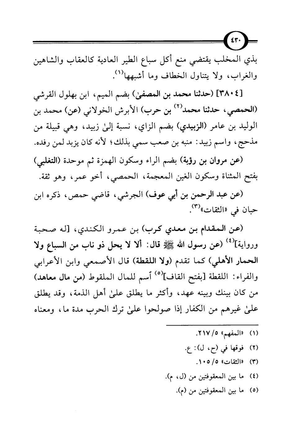 (عن المقدام بن معدي كرب) بن عمرو الكندي، [له صحبة ورواية] (¬4) (عن رسول اللَّه -صلى اللَّه عليه وسلم- قال: ألا لا يحل ذو ناب من السباع ولا الحمار الأهلي) كما تقدم (ولا اللقطة) قال الأصمعي وابن الأعرابي والفراء: اللقطة [بفتح القاف] (¬5) اسم للمال الملقوط (من مال معاهد) من كان بينك وبينه عهد، وأكثر ما يطلق على أهل الذمة، وقد يطلق على غيرهم من الكفار إذا صولحوا على ترك الحرب مدة ما، ومعناه