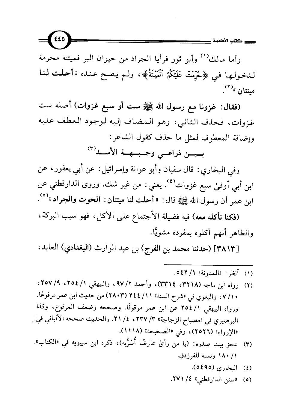وفي البخاري: قال سفيان وأبو عوانة وإسرائيل: عن أبي يعفور، عن ابن أبي أوفى سبع غزوات (¬4). يعني: من غير شك. وروى الدارقطني عن ابن عمر أن رسول اللَّه -صلى اللَّه عليه وسلم- قال: "أحلت لنا ميتتان: الحوت والجراد" (¬5).