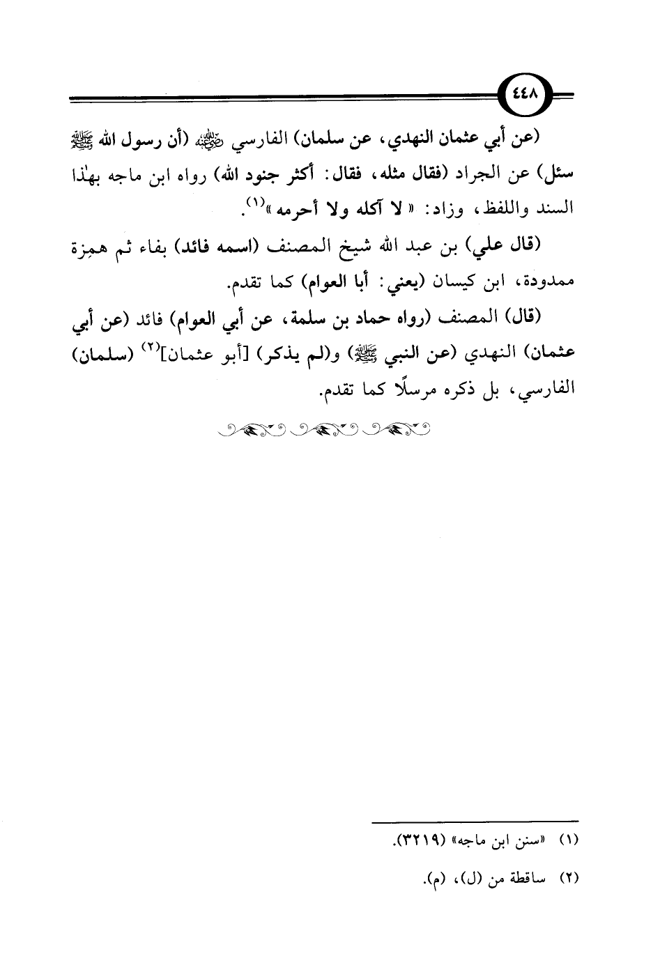 (عن أبي عثمان النهدي، عن سلمان) الفارسي -رضي اللَّه عنه- (أن رسول اللَّه -صلى اللَّه عليه وسلم- سئل) عن الجراد (فقال مثله، فقال: أكثر جنود اللَّه) رواه ابن ماجه بهذا السند واللفظ، وزاد: "لا آكله ولا أحرمه" (¬1).