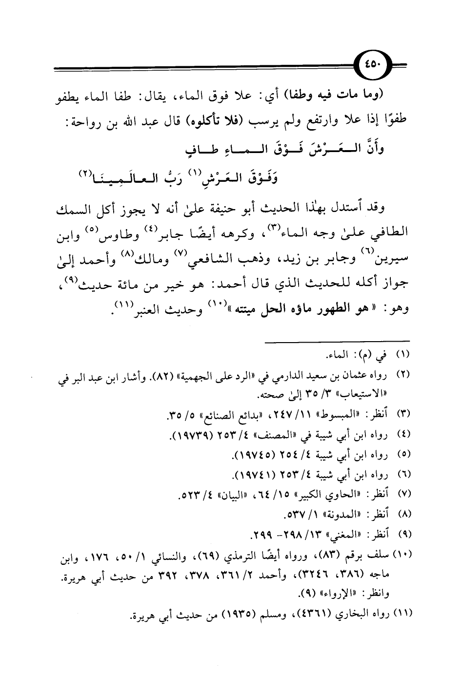 وقد استدل بهذا الحديث أبو حنيفة على أنه لا يجوز أكل السمك الطافي على وجه الماء (¬3)، وكرهه أيضًا جابر (¬4) وطاوس (¬5) وابن سيرين (¬6) وجابر بن زيد، وذهب الشافعي (¬7) ومالك (¬8) وأحمد إلى جواز أكله للحديث الذي قال أحمد: هو خير من مائة حديث (¬9)، وهو: "هو الطهور ماؤه الحل ميتته" (¬10) وحديث العنبر (¬11).