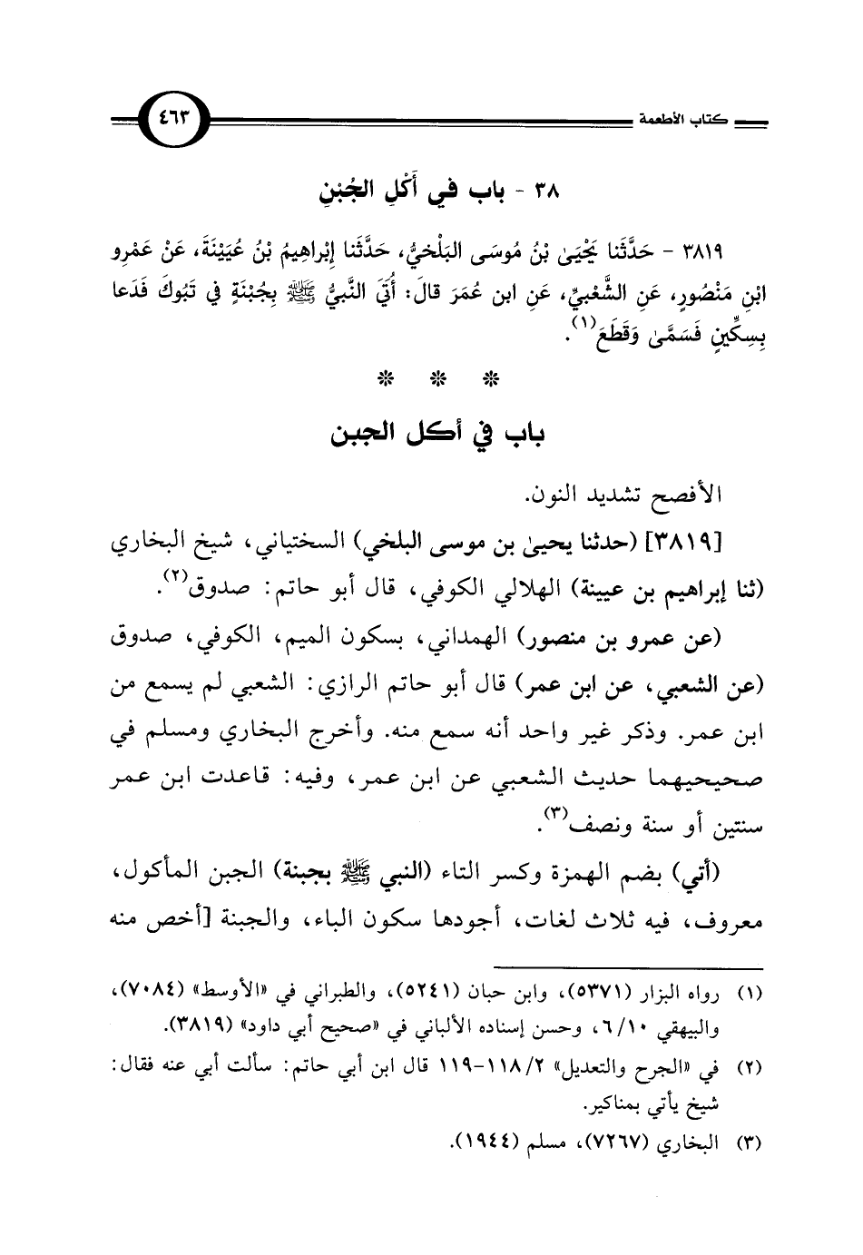 3819 - حَدَّثَنَا يَحْيَى بْنُ مُوسَى البَلْخيُّ، حَدَّثَنَا إِبْراهِيمُ بْنُ عُيَيْنَةَ، عَنْ عَمْرِو ابْنِ مَنْصُورٍ، عَنِ الشَّعْبِيِّ، عَنِ ابن عُمَرَ قالَ: أُتَيَّ النَّبِيُّ -صلى اللَّه عليه وسلم- بِجُبْنَةٍ في تَبُوكَ فَدَعَا بِسِكِّينٍ فَسَمَّى وَقَطَعَ (¬1).