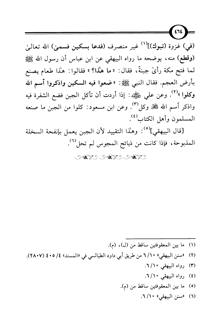 (في) غزوة (تبوك)] (¬1) غير منصرف (فدعا بسكين فسمى) اللَّه تعالى (وقطع) منه، يوضحه ما رواه البيهقي عن ابن عباس أن رسول اللَّه -صلى اللَّه عليه وسلم- لما فتح مكة رأى جبنةً، فقال: "ما هذا؟ " فقالوا: هذا طعام يصنع بأرض المعجم. فقال النبي -صلى اللَّه عليه وسلم-: "ضعوا فيه السكين واذكروا اسم اللَّه وكلوا" (¬2). وعن علي -رضي اللَّه عنه-: إذا أردت أن تأكل الجبن فضع الشفرة فيه واذكر اسم اللَّه -عز وجل- وكل (¬3). وعن ابن مسعود: كلوا من الجبن ما صنعه المسلمون وأهل الكتاب (¬4).