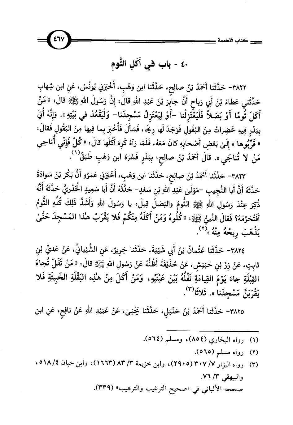 3823 - حَدَّثَنَا أَحْمَدُ بْنُ صالِحٍ، حَدَّثَنَا ابن وَهْبٍ، أَخْبَرَني عَمْرٌو أَنَّ بَكْرَ بْنَ سَوادَةَ حَدَّثَهُ أَنَّ أَبا النَّجِيبِ -مَوْلَى عَبْدِ اللَّهِ بْنِ سَعْدٍ- حَدَّثَهُ أَنَّ أَبا سَعِيدٍ الخُدْريَّ حَدَّثَهُ أَنَّهُ ذُكِرَ عِنْدَ رَسُولِ اللَّهِ -صلى اللَّه عليه وسلم- الثُّومُ والبَصَلُ قِيلَ: يا رَسُولَ اللَّهِ وَأَشَدُّ ذَلِكَ كُلِّهِ الثُّومُ أَفَتُحَرِّمُهُ؟ فَقالَ النَّبِيُّ -صلى اللَّه عليه وسلم-: "كُلُوهُ وَمَنْ أَكَلَهُ مِنْكُمْ فَلا يَقْرَبْ هَذَا المَسْجِدَ حَتَّى يَذْهَبَ رِيحُهُ مِنْهُ" (¬2).