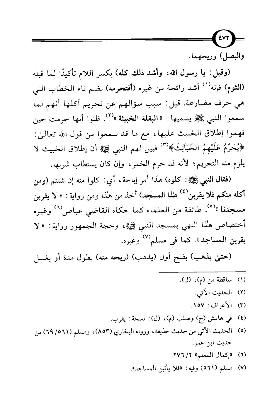 (وقيل: يا رسول اللَّه، وأشد ذلك كله) بكسر اللام تأكيدًا لما قبله (الثوم) فإنه (¬1) أشد رائحة من غيره (أفتحرمه) بضم تاء الخطاب التي هي حرف مضارعة. قيل: سبب سؤالهم عن تحريم أكلها أنهم لما سمعوا النبي -صلى اللَّه عليه وسلم- يسميها: "البقلة الخبيثة" (¬2). ظنوا أنها حرمت حين فهموا إطلاق الخبيث عليها، مع ما قد سمعوا من قول اللَّه تعالى: {وَيُحَرِّمُ عَلَيْهِمُ الْخَبَائِثَ} (¬3) فبين لهم النبي -صلى اللَّه عليه وسلم- أن إطلاق الخبيث لا يلزم منه التحريم؛ لأنه قد حرم الخمر، وإن كان يستطاب شربها.