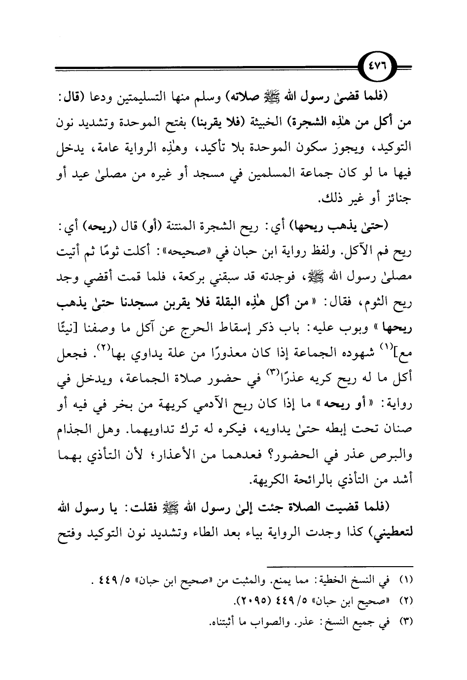 (حتى يذهب ريحها) أي: ريح الشجرة المنتنة (أو) قال (ريحه) أي: ريح فم الآكل. ولفظ رواية ابن حبان في "صحيحه": أكلت ثومًا ثم أتيت مصلى رسول اللَّه -صلى اللَّه عليه وسلم-، فوجدته قد سبقني بركعة، فلما قمت أقضي وجد ريح الثوم، فقال: "من أكل هذِه البقلة فلا يقربن مسجدنا حتى يذهب ريحها" وبوب عليه: باب ذكر إسقاط الحرج عن أَكل ما وصفنا [نيئًا مع] (¬1) شهوده الجماعة إذا كان معذورًا من علة يداوي بها (¬2). فجعل أكل ما له ريح كريه عذرًا (¬3) في حضور صلاة الجماعة، ويدخل في رواية: "أو ريحه" ما إذا كان ريح الآدمي كريهة من بخر في فيه أو صنان تحت إبطه حتى يداويه، فيكره له ترك تداويهما. وهل الجذام والبرص عذر في الحضور؟ فعدهما من الأعذار؛ لأن التأذي بهما أشد من التأذي بالرائحة الكريهة.