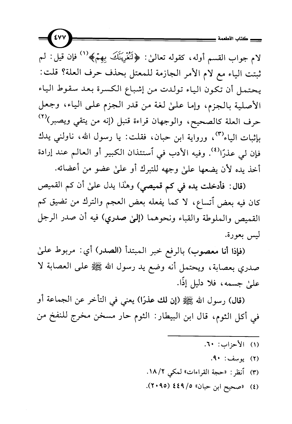 لام جواب القسم أوله، كقوله تعالى: {لَنُغْرِيَنَّكَ بِهِمْ} (¬1) فإن قيل: لم ثبتت الياء مع لام الأمر الجازمة للمعتل بحذف حرف العلة؟ قلت: يحتمل أن تكون الياء تولدت من إشباع الكسرة بعد سقوط الياء الأصلية بالجزم، هاما على لغة من قدر الجزم على الياء، وجعل حرف العلة كالصحيح، والوجهان قراءة قنبل (إنه من يتقي ويصبر) (¬2) بإثبات الياء (¬3)، ورواية ابن حبان، فقلت: يا رسول اللَّه، ناولني يدك فإن لي عذرًا (¬4). وفيه الأدب في استئذان الكبير أو العالم عند إرادة أخذ يده لأن يضعها على وجهه للتبرك أو على عضو من أعضائه.