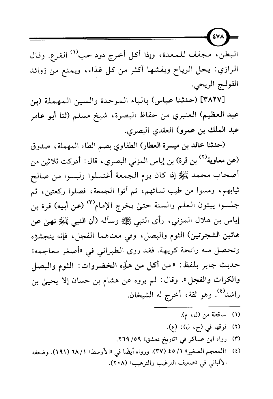 (حدثنا خالد بن ميسرة العطار) الطفاوي بضم الطاء المهملة، صدوق (عن معاوبة (¬2) بن قرة) بن إياس المزني البصري، قال: أدركت ثلاثين من أصحاب محمد -صلى اللَّه عليه وسلم- إذا كان يوم الجمعة اغتسلوا ولبسوا من صالح ثيابهم، ومسوا من طيب نسائهم، ثم أتوا الجمعة، فصلوا ركعتين، ثم جلسوا يبثون العلم والسنة حتى يخرج الإمام (¬3) (عن أبيه) قرة بن إياس بن هلال المزني، رأى النبي -صلى اللَّه عليه وسلم- وسأله (أن النبي -صلى اللَّه عليه وسلم- نهى عن هاتين الشجرتين) الثوم والبصل، وفي معناهما الفجل، فإنه يتجشؤه وتحصل منه رائحة كريهة. فقد روى الطبراني في "أصغر معاجمه" حديث جابر بلفظ: "من أكل من هذِه الخضروات: الثوم والبصل والكراث والفجل". وقال: لم يروه عن هشام بن حسان إلا يحيى بن راشد (¬4). وهو ثقة، أخرج له الشيخان.