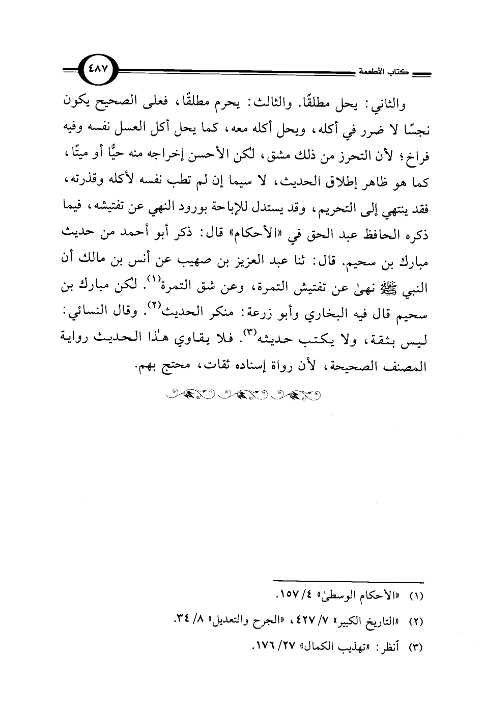 والثاني: يحل مطلقًا. والثالث: يحرم مطلقًا، فعلى الصحيح يكون نجسًا لا ضرر في أكله، ويحل أكله معه، كما يحل أكل العسل نفسه وفيه فراخ؛ لأن التحرز من ذلك مشق، لكن الأحسن إخراجه منه حيًّا أو ميتًا، كما هو ظاهر إطلاق الحديث، لا سيما إن لم تطب نفسه لأكله وقذرته، فقد ينتهي إلى التحريم، وقد يستدل للإباحة بورود النهي عن تفتيشه، فيما ذكره الحافظ عبد الحق في "الأحكام" قال: ذكر أبو أحمد من حديث مبارك بن سحيم. قال: ثنا عبد العزيز بن صهيب عن أنس بن مالك أن النبي -صلى اللَّه عليه وسلم- نهى عن تفتيش التمرة، وعن شق التمرة (¬1). لكن مبارك بن سحيم قال فيه البخاري وأبو زرعة: منكر الحديث (¬2). وقال النسائي: ليس بثقة، ولا يكتب حديثه (¬3). فلا يقاوي هذا الحديث رواية المصنف الصحيحة، لأن رواة إسناده ثقات، محتج بهم.