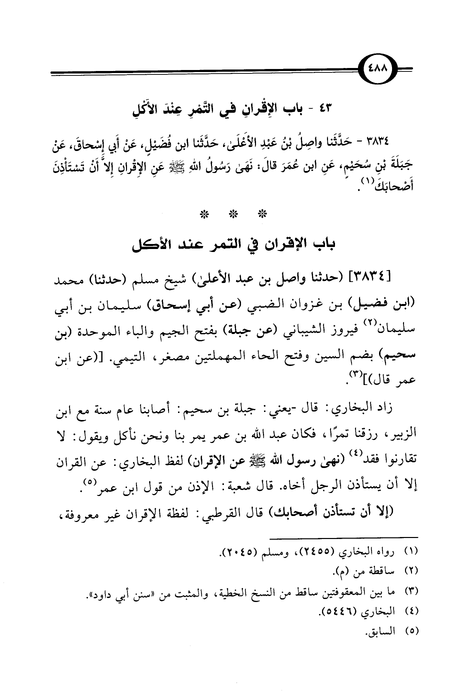 زاد البخاري: قال -يعني: جبلة بن سحيم: أصابنا عام سنة مع ابن الزبير، رزقنا تمرًا، فكان عبد اللَّه بن عمر يمر بنا ونحن نأكل ويقول: لا تقارنوا فقد (¬4) (نهى رسول اللَّه -صلى اللَّه عليه وسلم- عن الإقران) لفظ البخاري: عن القران إلا أن يستأذن الرجل أخاه. قال شعبة: الإذن من قول ابن عمر (¬5).