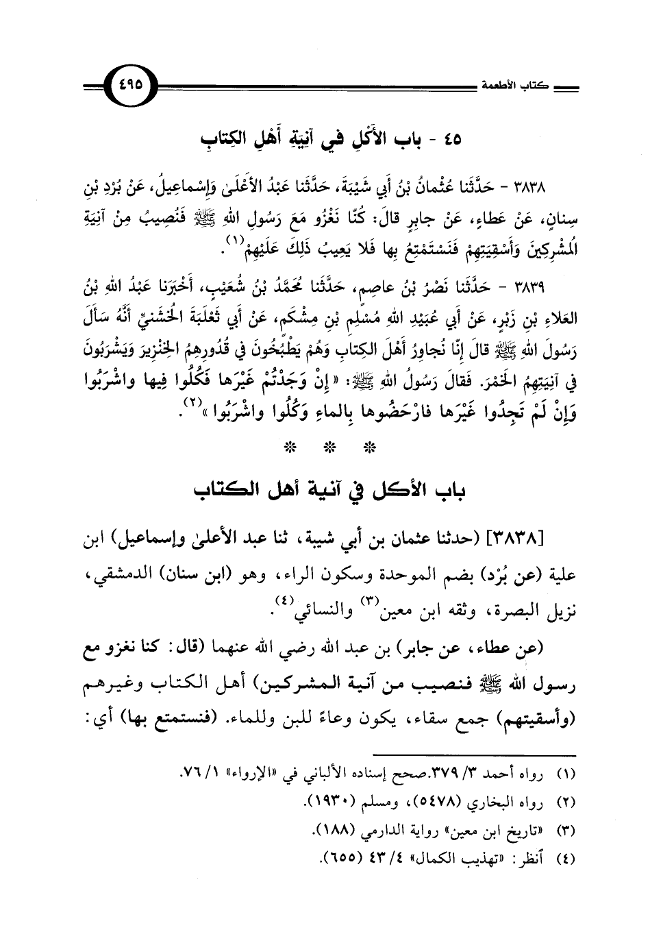 (عن عطاء، عن جابر) بن عبد اللَّه رضي اللَّه عنهما (قال: كنا نغزو مع رسول اللَّه -صلى اللَّه عليه وسلم- فنصيب من آنية المشركين) أهل الكتاب وغيرهم (وأسقيتهم) جمع سقاء، يكون وعاءً للبن وللماء. (فنستمتع بها) أي: