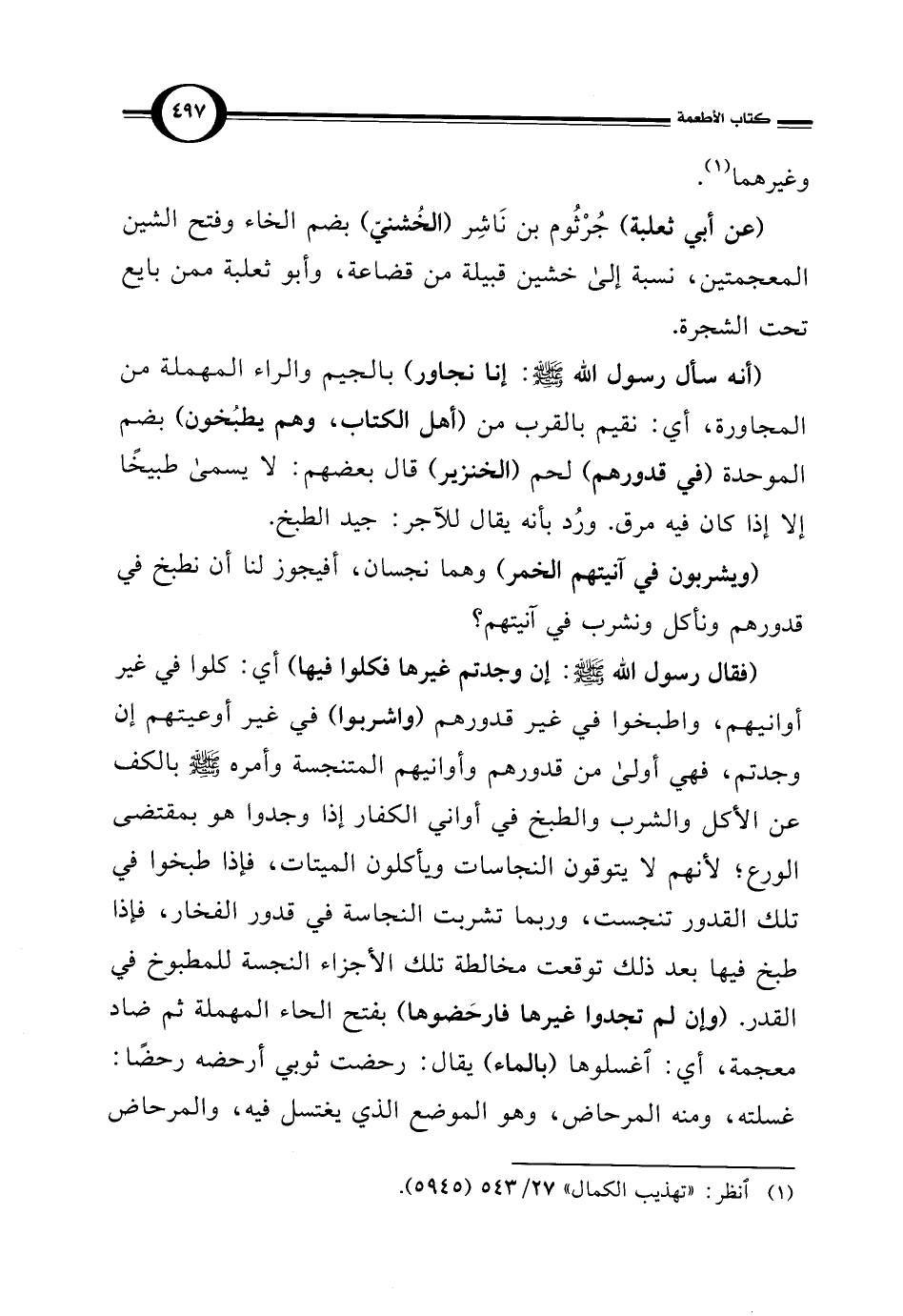 (أنه سأل رسول اللَّه -صلى اللَّه عليه وسلم-: إنا نجاور) بالجيم والراء المهملة من المجاورة، أي: نقيم بالقرب من (أهل الكتاب، وهم يطبُخون) بضم الموحدة (في قدورهم) لحم (الخنزير) قال بعضهم: لا يسمى طبيخًا إلا إذا كان فيه مرق. ورُد بأنه يقال للآجر: جيد الطبخ.