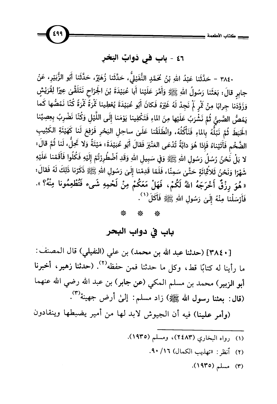 [3840] (حدثنا عبد اللَّه بن محمد) بن علي (النفيلي) قال المصنف: ما رأينا له كتابًا قط، وكل ما حدثنا فمن حفظه (¬2). (حدثنا زهير، أخبرنا أبو الزبير) محمد بن مسلم المكي (عن جابر) بن عبد اللَّه رضي اللَّه عنهما (قال: بعثنا رسول اللَّه -صلى اللَّه عليه وسلم-) زاد مسلم: إلى أرض جهينة (¬3).