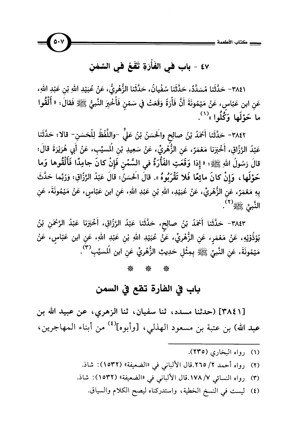 3841 - حَدَّثَنَا مُسَدَّدٌ، حَدَّثَنَا سُفْيانُ، حَدَّثَنَا الزُّهْريُّ، عَنْ عُبَيْدِ اللَّهِ بْنِ عَبْدِ اللَّهِ، عَنِ ابن عَبَّاسٍ، عَنْ مَيْمُونَةَ أَنَّ فَأْرَةً وَقَعَتْ في سَمْنٍ فَأُخْبِرَ النَّبِيُّ -صلى اللَّه عليه وسلم- فَقالَ: "أَلْقُوا ما حَوْلَها وَكُلُوا" (¬1).