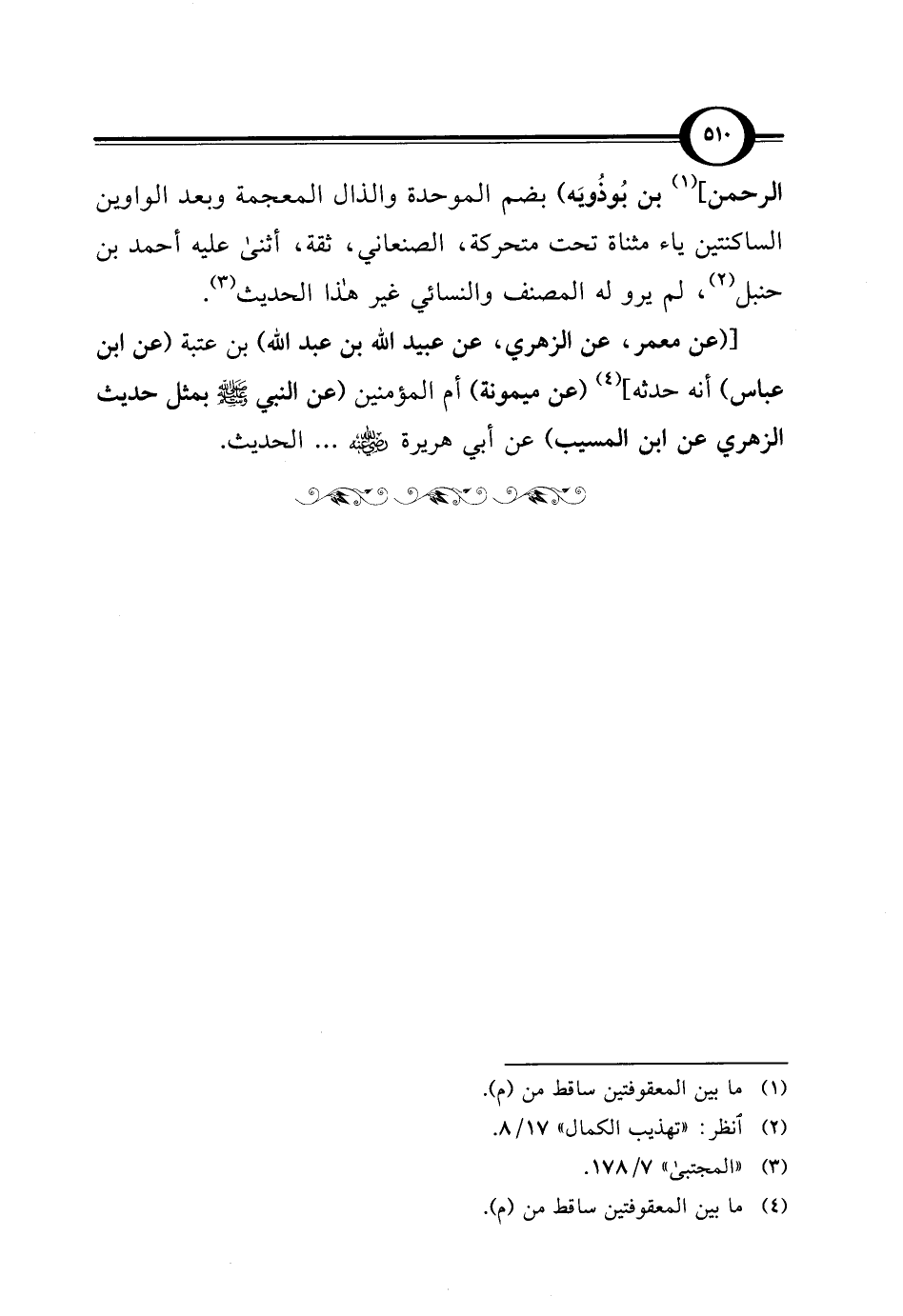 الرحمن] (¬1) بن بُوذُويَه) بضم الموحدة والذال المعجمة وبعد الواوين الساكنتين ياء مثناة تحت متحركة، الصنعاني، ثقة، أثنى عليه أحمد بن حنبل (¬2)، لم يرو له المصنف والنسائي غير هذا الحديث (¬3).