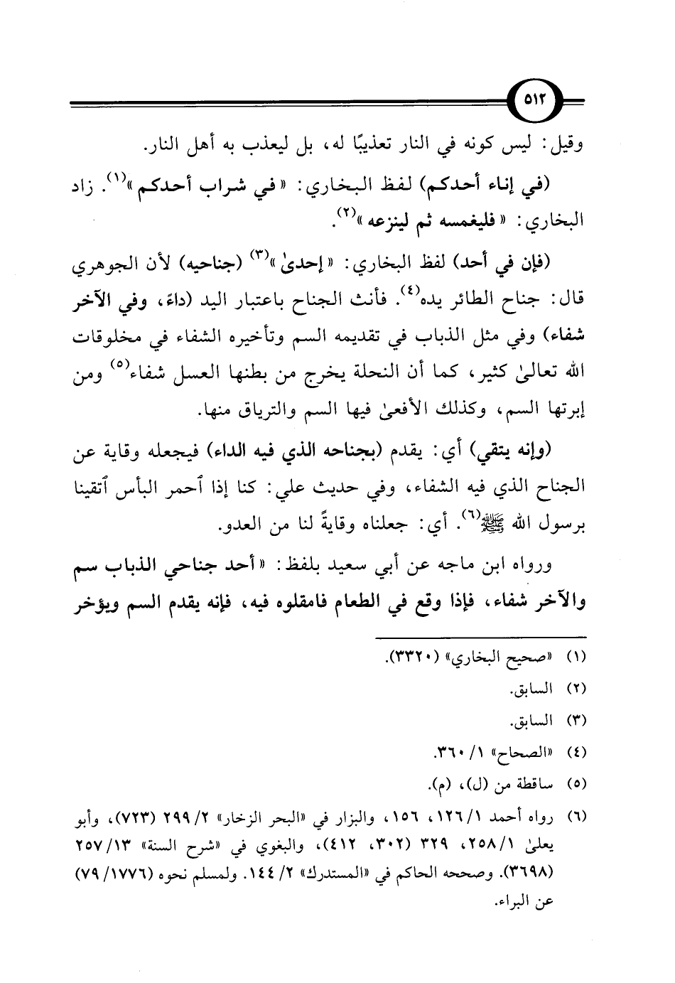 (فإن في أحد) لفظ البخاري: "إحدى" (¬3) (جناحيه) لأن الجوهري قال: جناح الطائر يده (¬4). فأنث الجناح باعتبار اليد (داءً، وفي الآخر شفاء) وفي مثل الذباب في تقديمه السم وتأخيره الشفاء في مخلوقات اللَّه تعالى كثير، كما أن النحلة يخرج من بطنها العسل شفاء (¬5) ومن إبرتها السم، وكذلك الأفعى فيها السم والترياق منها.