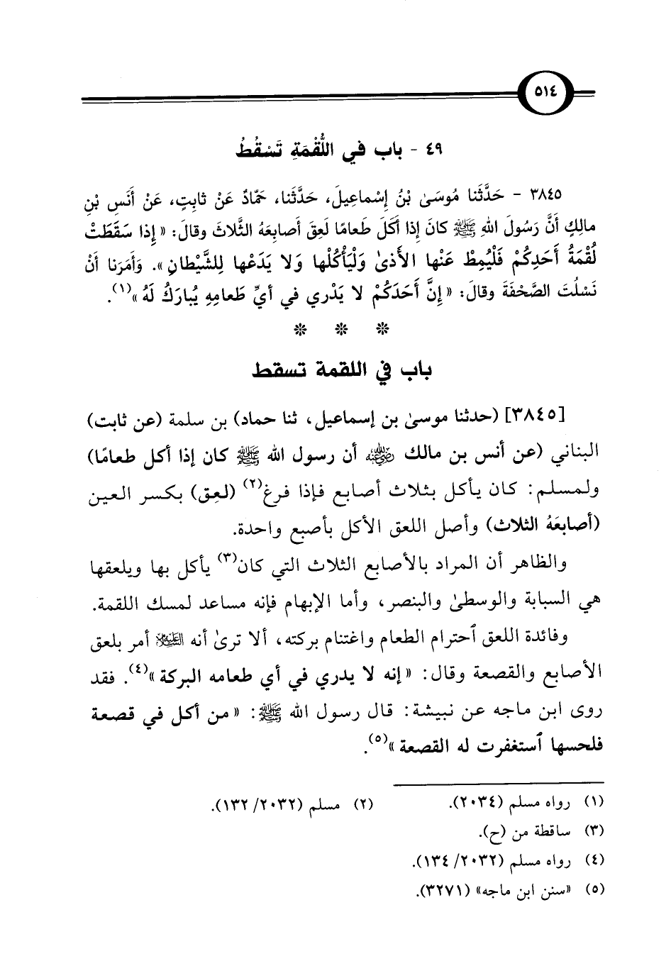 [3845] (حدثنا موسى بن إسماعيل، ثنا حماد) بن سلمة (عن ثابت) البناني (عن أنس بن مالك -رضي اللَّه عنه- أن رسول اللَّه -صلى اللَّه عليه وسلم- كان إذا أكل طعامًا) ولمسلم: كان يأكل بثلاث أصابع فإذا فرغ (¬2) (لعِق) بكسر العين (أصابعَهُ الثلاث) وأصل اللعق الأكل بأصبع واحدة.