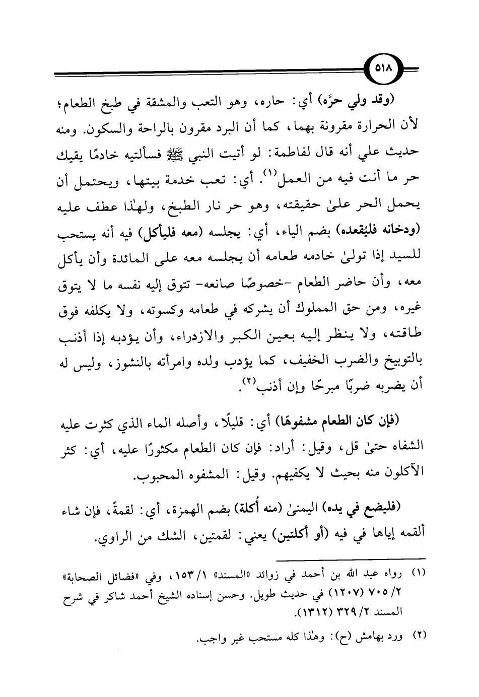(وقد ولي حرَّه) أي: حاره، وهو التعب والمشقة في طبخ الطعام؛ لأن الحرارة مقرونة بهما، كما أن البرد مقرون بالراحة والسكون. ومنه حديث علي أنه قال لفاطمة: لو أتيت النبي -صلى اللَّه عليه وسلم- فسألتيه خادمًا يقيك حر ما أنت فيه من العمل (¬1). أي؛ تعب خدمة بيتها، ويحتمل أن يحمل الحر على حقيقته، وهو حر نار الطبخ، ولهذا عطف عليه (ودخانه فليُقعده) بضم الياء، أي: يجلسه (معه فليأكل) فيه أنه يستحب للسيد إذا تولى خادمه طعامه أن يجلسه معه على المائدة وأن يأكل معه، وأن حاضر الطعام -خصوصًا صانعه- تتوق إليه نفسه ما لا يتوق غيره، ومن حق المملوك أن يشركه في طعامه وكسوته، ولا يكلفه فوق طاقته، ولا ينظر إليه بعين الكبر والازدراء، وأن يؤدبه إذا أذنب بالتوبيخ والضرب الخفيف، كما يؤدب ولده وامرأته بالنشوز، وليس له أن يضربه ضربًا مبرحًا وإن أذنب (¬2).