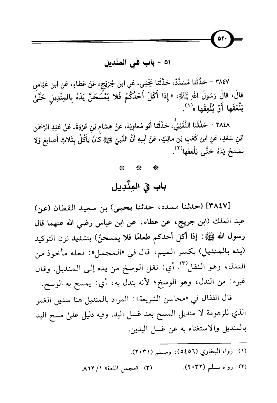 [3847] (حدثنا مسدد، حدثنا يحيى) بن سعيد القطان (عن) عبد الملك (ابن جريج، عن عطاء، عن ابن عباس رضي اللَّه عنهما قال رسول اللَّه -صلى اللَّه عليه وسلم-: إذا أكل أحدكم طعامًا فلا يمسحنَّ) بتشديد نون التوكيد (يده بالمِنديل) بكسر الميم، قال في "المجمل": لعله مأخوذ من الندل، وهو النقل (¬3). أي: نقل الوسخ من يده إلى المنديل. وقال غيره: من الندل، وهو الوسخ؛ لأنه يندل به، أي: يمسح به الوسخ.