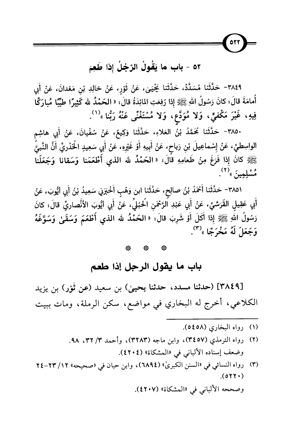 [3849] (حدثنا مسدد، حدثنا يحيى) بن سعيد (عن ثَوْر) بن يزيد الكلاعي، أخرج له البخاري في مواضع، سكن الرملة، ومات ببيت