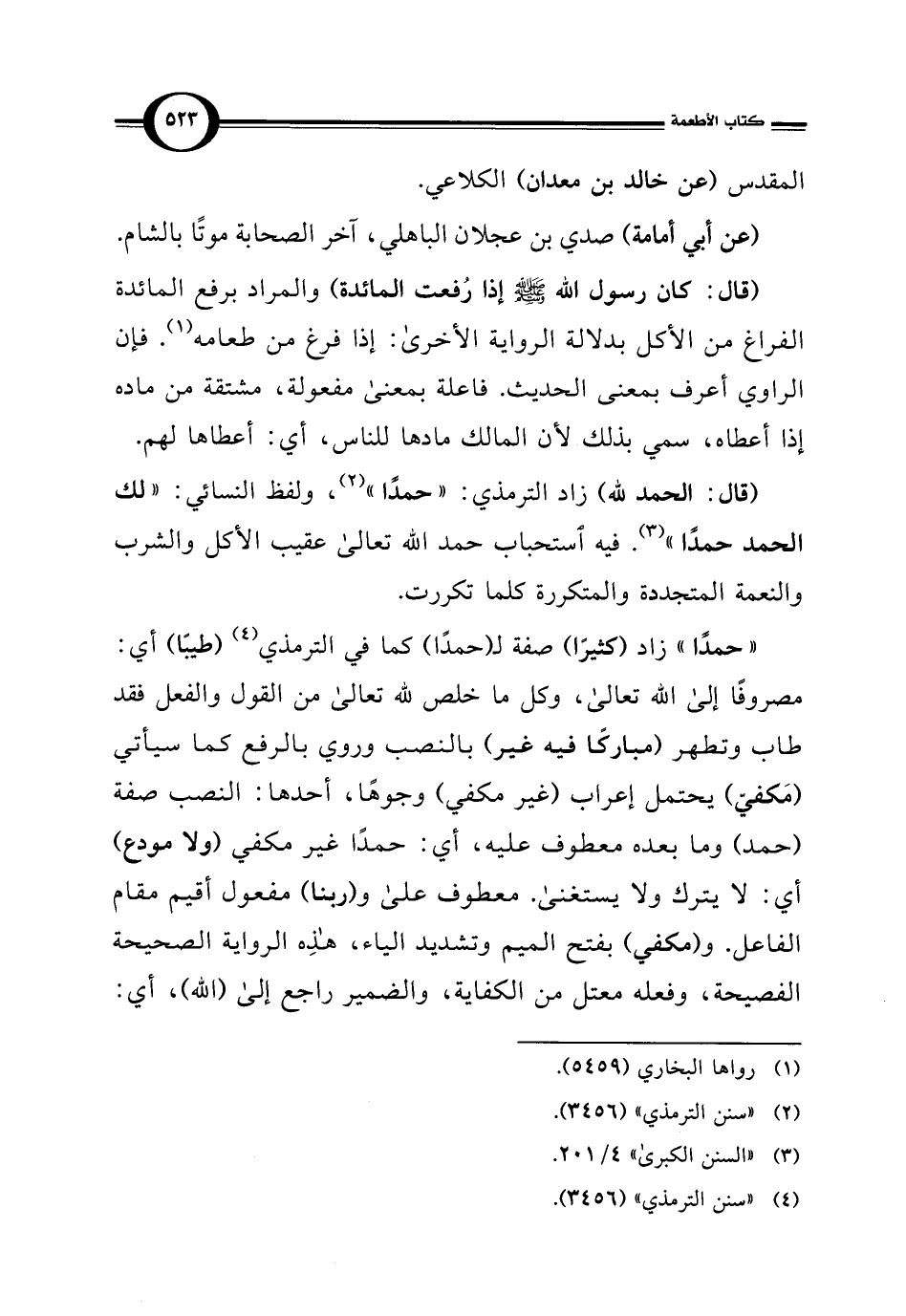 "حمدًا" زاد (كثيرًا) صفة لـ (حمدًا) كما في الترمذي (¬4) (طيبًا) أي: مصروفًا إلى اللَّه تعالى، وكل ما خلص للَّه تعالى من القول والفعل فقد طاب وتطهر (مباركًا فيه غير) بالنصب وروي بالرفع كما سيأتي (مَكفيّ) يحتمل إعراب (غير مكفي) وجوهًا، أحدها: النصب صفة (حمد) وما بعده معطوف عليه، أي: حمدًا غير مكفي (ولا مودع) أي: لا يترك ولا يستغنى. معطوف على و (ربنا) مفعول أقيم مقام الفاعل. و (مكفي) بفتح الميم وتشديد الياء، هذِه الرواية الصحيحة الفصيحة، وفعله معتل من الكفاية، والضمير راجع إلى (اللَّه)، أي: