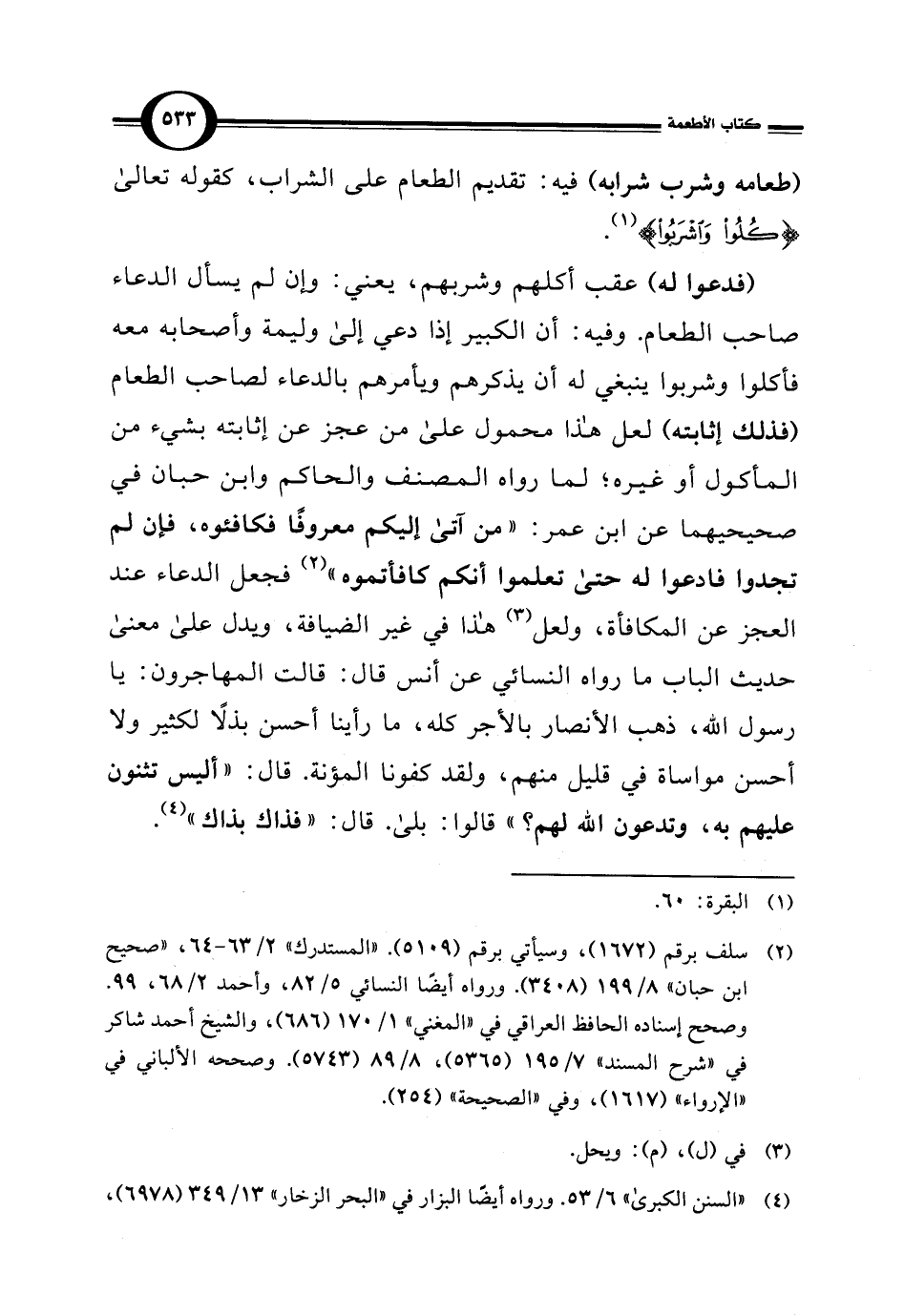 (طعامه وشرب شرابه) فيه: تقديم الطعام على الشراب، كقوله تعالى {كُلُوا وَاشْرَبُوا} (¬1).