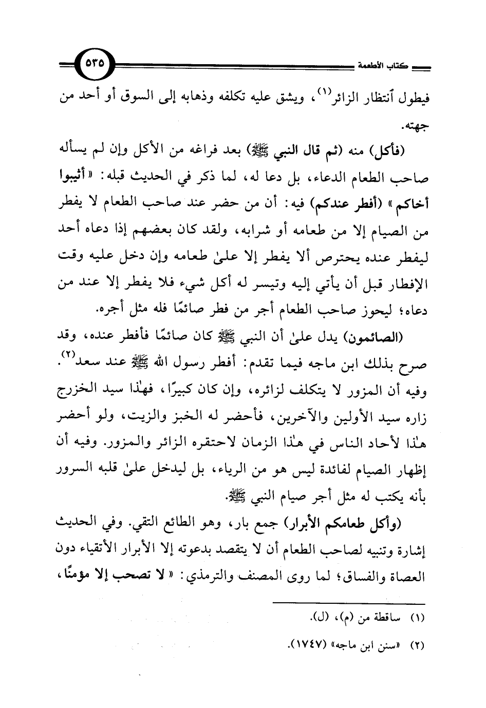 (الصائمون) يدل على أن النبي -صلى اللَّه عليه وسلم- كان صائمًا فأفطر عنده، وقد صرح بذلك ابن ماجه فيما تقدم: أفطر رسول اللَّه -صلى اللَّه عليه وسلم- عند سعد (¬2). وفيه أن المزور لا يتكلف لزائره، وإن كان كبيرًا، فهذا سيد الخزرج زاره سيد الأولين والآخرين، فأحضر له الخبز والزيت، ولو أحضر هذا لأحاد الناس في هذا الزمان لاحتقره الزائر والمزور. وفيه أن إظهار الصيام لفائدة ليس هو من الرياء، بل ليدخل على قلبه السرور بأنه يكتب له مثل أجر صيام النبي -صلى اللَّه عليه وسلم-.
