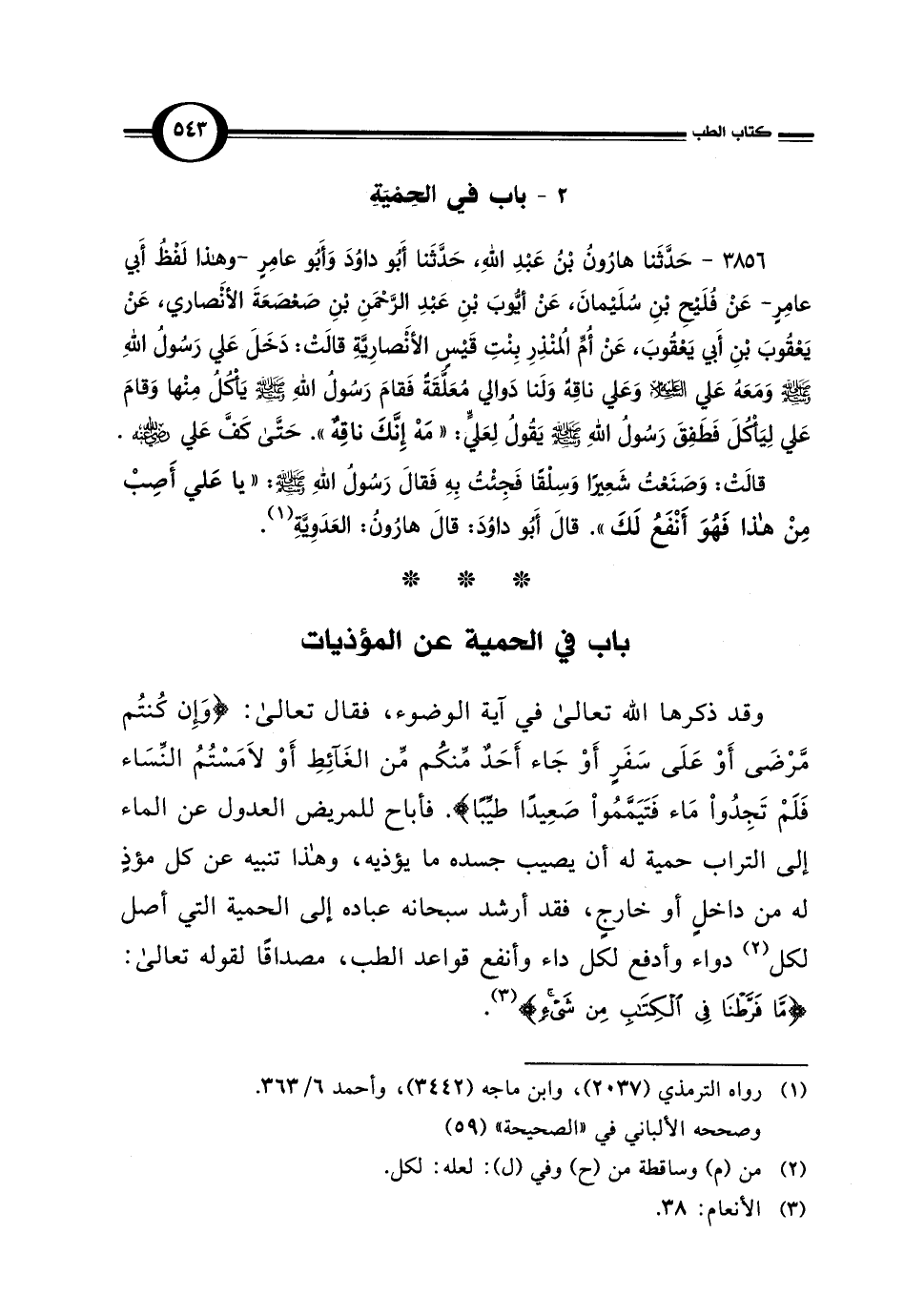 وقد ذكرها اللَّه تعالى في آية الوضوء، فقال تعالى: {وَإِنْ كُنْتُمْ مَرْضَى أَوْ عَلَى سَفَرٍ أَوْ جَاءَ أَحَدٌ مِنْكُمْ مِنَ الْغَائِطِ أَوْ لَامَسْتُمُ النِّسَاءَ فَلَمْ تَجِدُوا مَاءً فَتَيَمَّمُوا صَعِيدًا طَيِّبًا}. فأباح للمريض العدول عن الماء إلى التراب حمية له أن يصيب جسده ما يؤذيه، وهذا تنبيه عن كل مؤذٍ له من داخلٍ أو خارجٍ، فقد أرشد سبحانه عباده إلى الحمية التي أصل لكل (¬2) دواء وأدفع لكل داء وأنفع قواعد الطب، مصداقًا لقوله تعالى: {مَا فَرَّطْنَا فِي الْكِتَابِ مِنْ شَيْءٍ} (¬3).