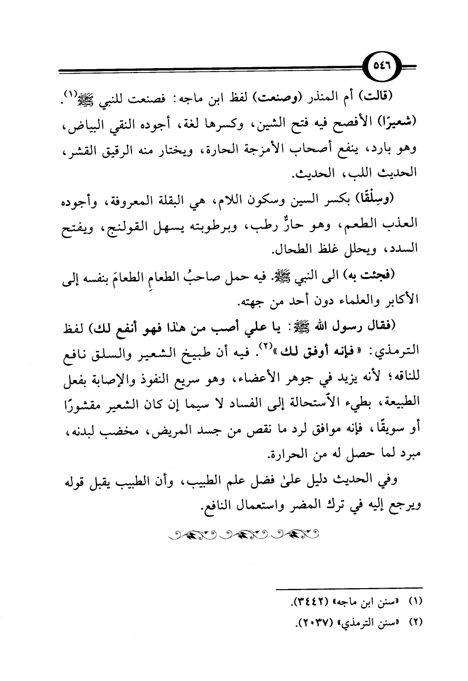 (فقال رسول اللَّه -صلى اللَّه عليه وسلم-: يا علي أصب من هذا فهو أنفع لك) لفظ الترمذي: "فإنه أوفق لك" (¬2). فيه أن طبيخ الشعير والسلق نافع للناقه؛ لأنه يزيد في جوهر الأعضاء، وهو سريع النفوذ والإصابة بفعل الطبيعة، بطيء الاستحالة إلى الفساد لا سيما إن كان الشعير مقشورًا أو سويقًا، فإنه موافق لرد ما نقص من جسد المريض، مخضب لبدنه، مبرد لما حصل له من الحرارة.