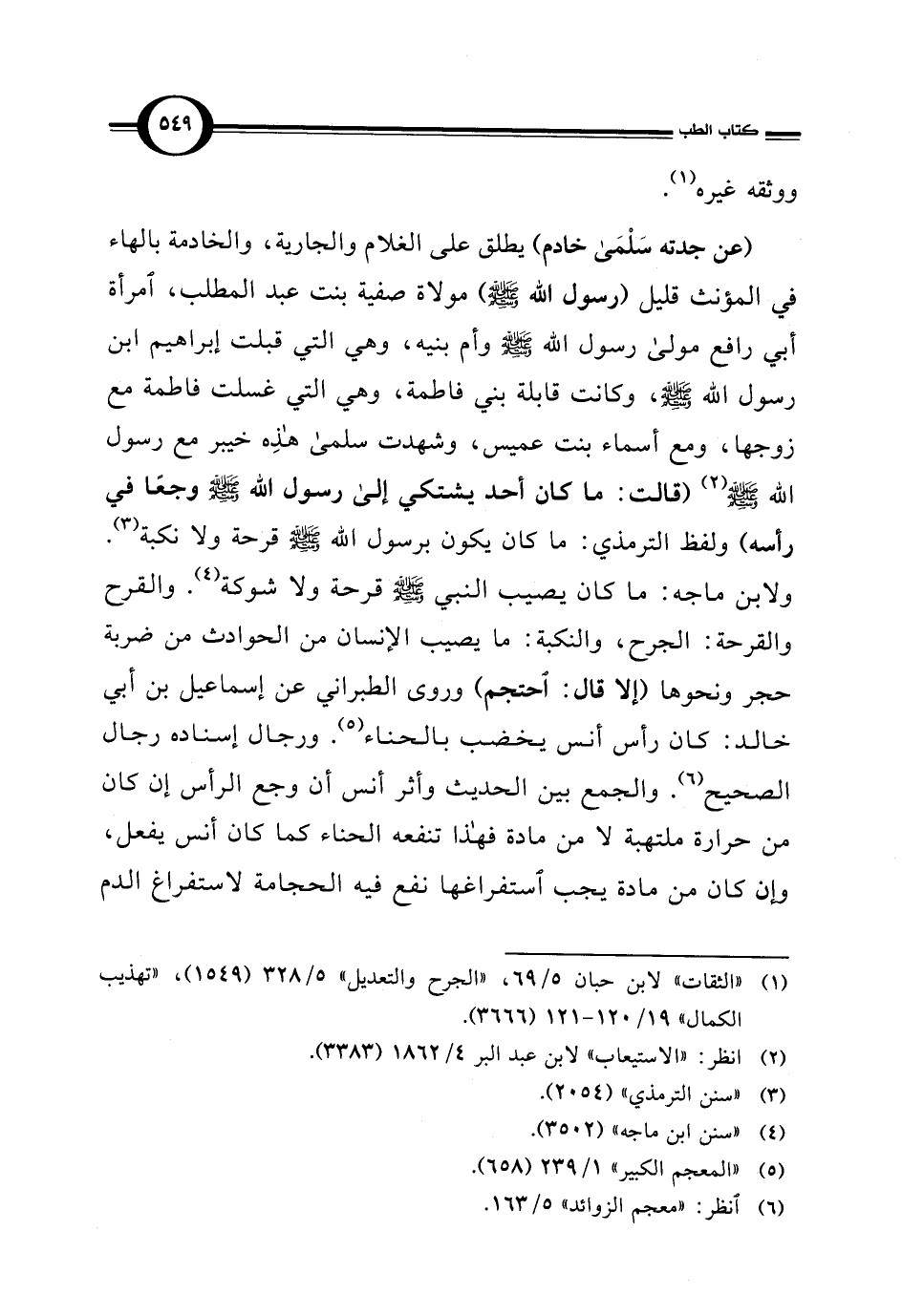 ولابن ماجه: ما كان يصيب النبي -صلى اللَّه عليه وسلم- قرحة ولا شوكة (¬4). والقرح والقرحة: الجرح، والنكبة: ما يصيب الإنسان من الحوادث من ضربة حجر ونحوها (إلا قال: احتجم) وروى الطبراني عن إسماعيل بن أبي خالد: كان رأس أنس يخضب بالحناء (¬5). ورجال إسناده رجال الصحيح (¬6). والجمع بين الحديث وأثر أنس أن وجع الرأس إن كان من حرارة ملتهبة لا من مادة فهذا تنفعه الحناء كما كان أنس يفعل، وإن كان من مادة يجب استفراغها نفع فيه الحجامة لاستفراغ الدم