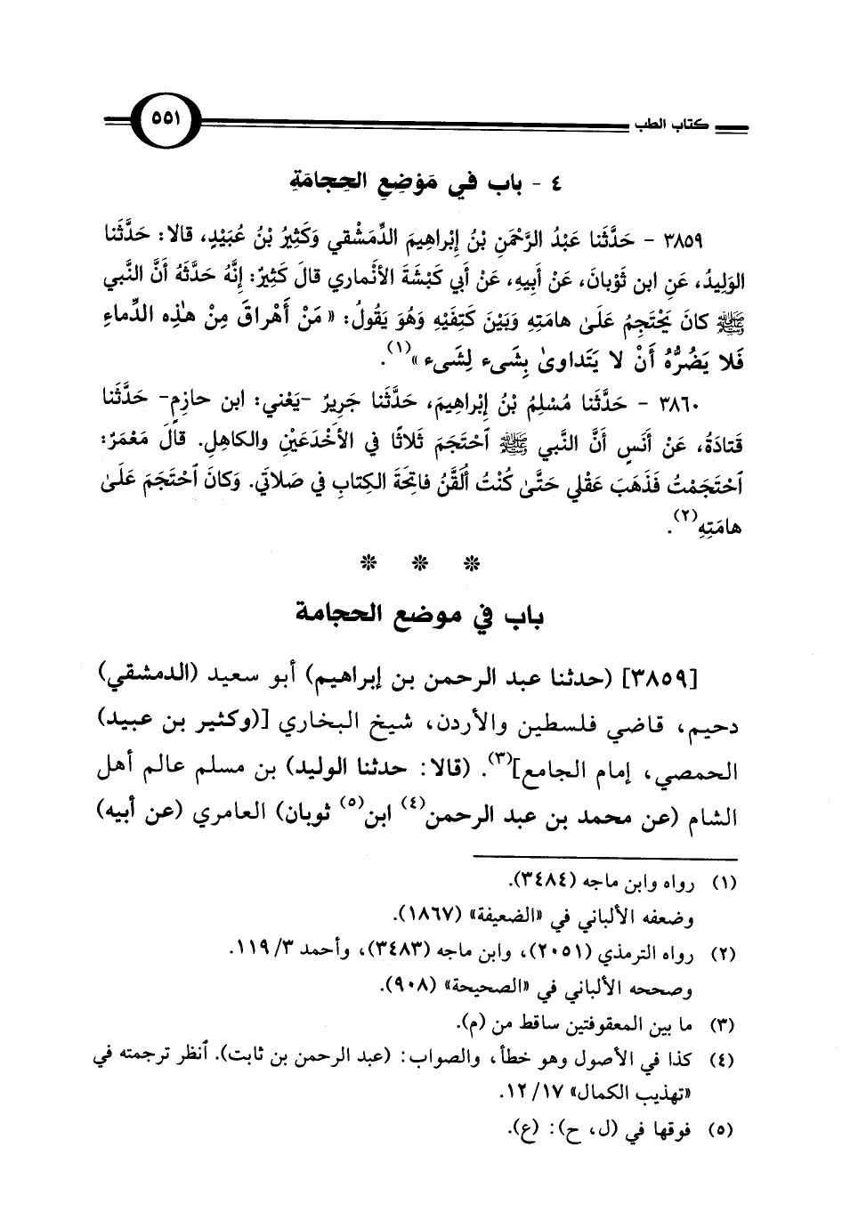 [3859] (حدثنا عبد الرحمن بن إبراهيم) أبو سعيد (الدمشقي) دحيم، قاضي فلسطين والأردن، شيخ البخاري [(وكثير بن عبيد) الحمصي، إمام الجامع] (¬3). (قالا: حدثنا الوليد) بن مسلم عالم أهل الشام (عن محمد بن عبد الرحمن (¬4) ابن (¬5) ثوبان) العامري (عن أبيه)