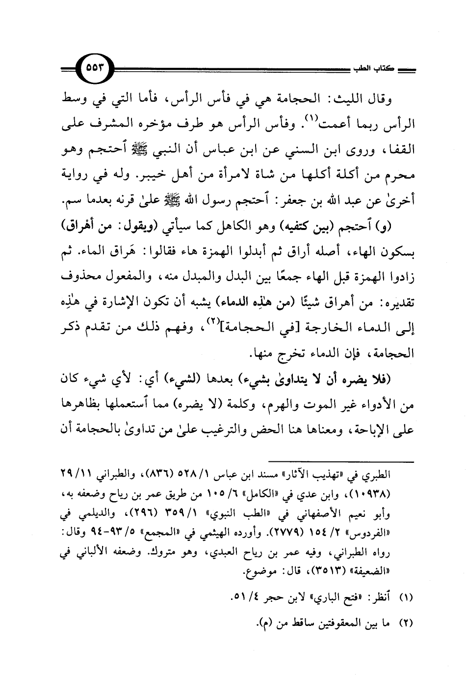 وقال الليث: الحجامة هي في فأس الرأس، فأما التي في وسط الرأس ربما أعمت (¬1). وفأس الرأس هو طرف مؤخره المشرف على القفا، وروى ابن السني عن ابن عباس أن النبي -صلى اللَّه عليه وسلم- احتجم وهو محرم من أكلة أكلها من شاة لامرأة من أهل خيبر. وله في رواية أخرى عن عبد اللَّه بن جعفر: احتجم رسول اللَّه -صلى اللَّه عليه وسلم- على قرنه بعدما سم.