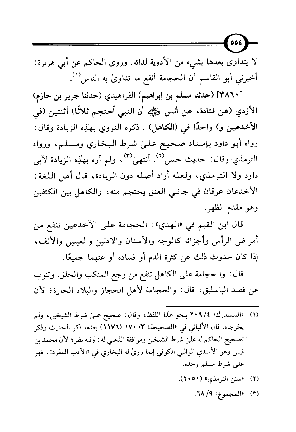 [3860] (حدثنا مسلم بن إبراهيم) الفراهيدي (حدثنا جرير بن حازم) الأزدي (عن قتادة، عن أنس -رضي اللَّه عنه- أن النبي احتجم ثلاثًا) اثنتين (في الأخدعين و) واحدًا في (الكاهل). ذكره النووي بهذِه الزيادة وقال: رواه أبو داود بإسناد صحيح على شرط البخاري ومسلم، ورواه الترمذي وقال: حديث حسن (¬2). انتهى (¬3)، ولم أره بهذِه الزيادة لأبي داود ولا الترمذي، ولعله أراد أصله دون الزيادة، قال أهل اللغة: الأخدعان عرقان في جانبي العنق يحتجم منه، والكاهل بين الكتفين وهو مقدم الظهر.