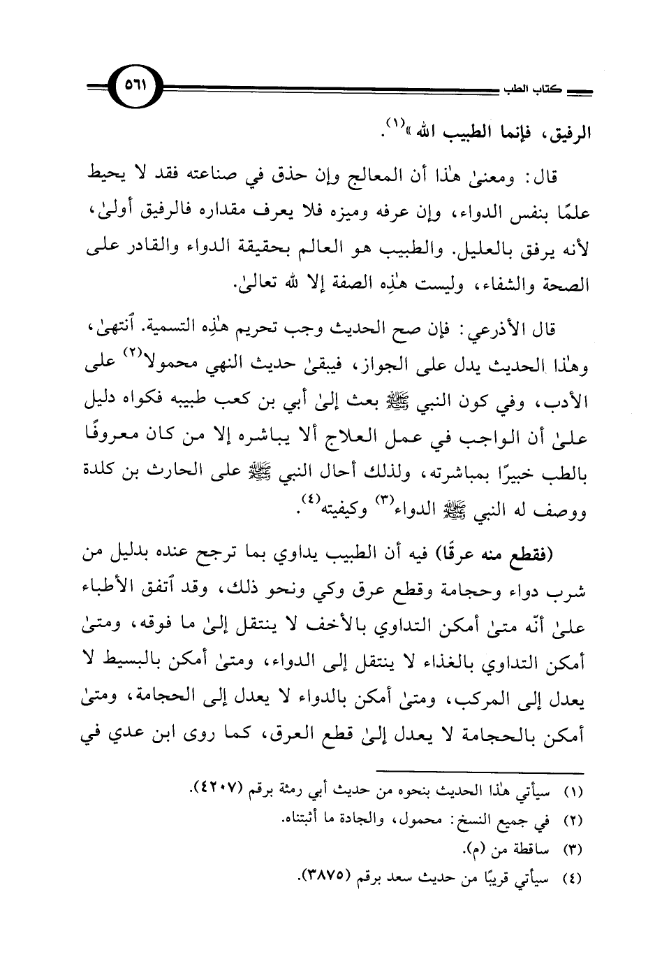 قال الأذرعي: فإن صح الحديث وجب تحريم هذِه التسمية. انتهى، وهذا الحديث يدل على الجواز، فيبقى حديث النهي محمولا (¬2) على الأدب، وفي كون النبي -صلى اللَّه عليه وسلم- بعث إلى أبي بن كعب طبيبه فكواه دليل على أن الواجب في عمل العلاج ألا يباشره إلا من كان معروفًا بالطب خبيرًا بمباشرته، ولذلك أحال النبي -صلى اللَّه عليه وسلم- على الحارث بن كلدة ووصف له النبي -صلى اللَّه عليه وسلم- الدواء (¬3) وكيفيته (¬4).
