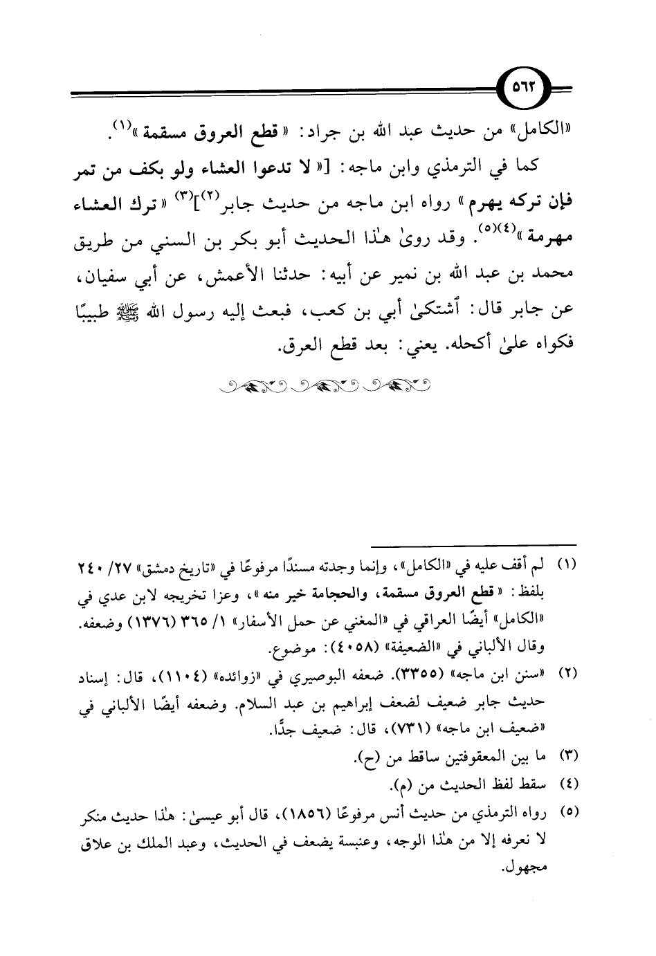كما في الترمذي وابن ماجه: ["لا تدعوا العشاء ولو بكف من تمر فإن تركه يهرم" رواه ابن ماجه من حديث جابر (¬2)] (¬3) "ترك العشاء مهرمة" (¬4) (¬5). وقد روى هذا الحديث أبو بكر بن السني من طريق محمد بن عبد اللَّه بن نمير عن أبيه: حدثنا الأعمش، عن أبي سفيان، عن جابر قال: اشتكى أبي بن كعب، فبعث إليه رسول اللَّه -صلى اللَّه عليه وسلم- طبيبًا فكواه على أكحله. يعني: بعد قطع العرق.
