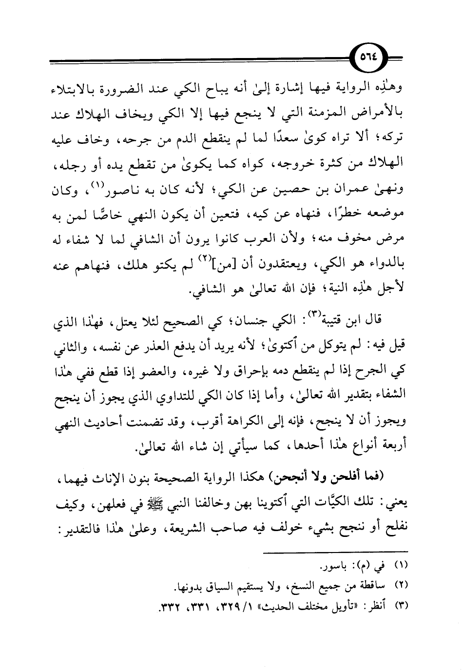 (فما أفلحن ولا أنجحن) هكذا الرواية الصحيحة بنون الإناث فيهما، يعني: تلك الكيَّات التي أكتوينا بهن وخالفنا النبي -صلى اللَّه عليه وسلم- في فعلهن، وكيف نفلح أو ننجح بشيء خولف فيه صاحب الشريعة، وعلى هذا فالتقدير: