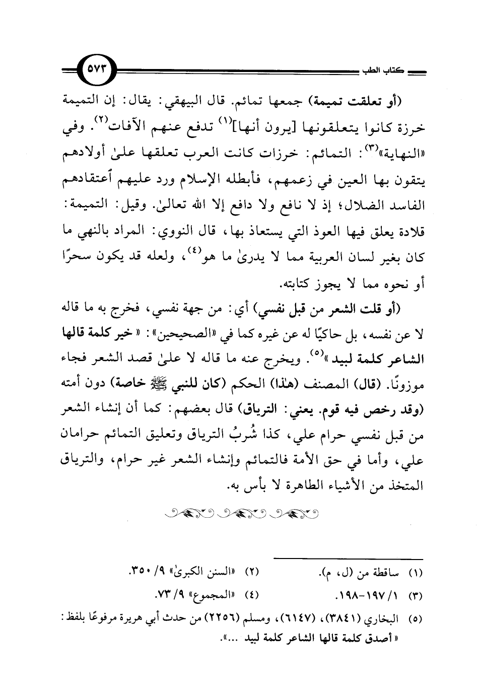 (أو قلت الشعر من قبل نفسي) أي: من جهة نفسي، فخرج به ما قاله لا عن نفسه، بل حاكيًا له عن غيره كما في "الصحيحين": "خير كلمة قالها الشاعر كلمة لبيد" (¬5). ويخرج عنه ما قاله لا على قصد الشعر فجاء موزونًا. (قال) المصنف (هذا) الحكم (كان للنبي -صلى اللَّه عليه وسلم- خاصة) دون أمته (وقد رخص فيه قوم. يعني: الترياق) قال بعضهم: كما أن إنشاء الشعر من قبل نفسي حرام علي، كذا شُربُ الترياق وتعليق التمائم حرامان علي، وأما في حق الأمة فالتمائم وإنشاء الشعر غير حرام، والترياق المتخذ من الأشياء الطاهرة لا بأس به.
